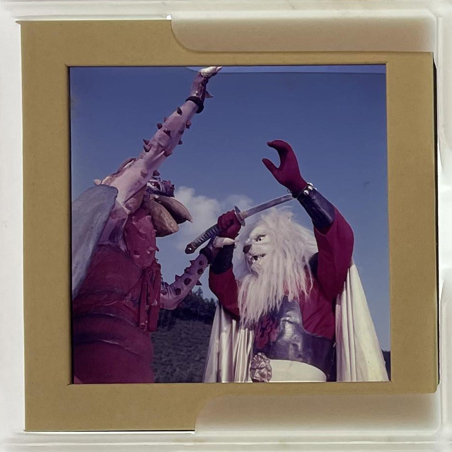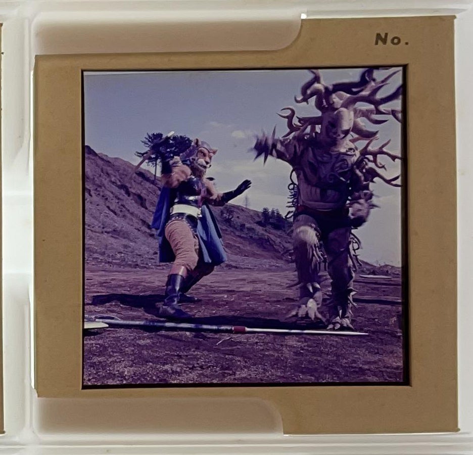 第24話に登場するトビムサシは、『快傑』前半でも最強クラス、キャラとしての魅力も抜群な怪人。これは、トビムサシが金砂地の太刀を叩き折ってサーベルを投げた直後と思しき一枚だ。ライオン丸と比べても目を引く色彩のトビムサシだが、フィルムからは両者の色の違いもわかる。