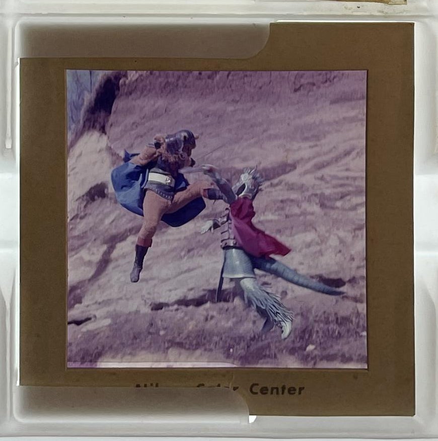 原口 今回発見されたポジは、もう間違いなく出版社がそのグラビアを作るためにカメラマンを現場に派遣して、その方たちが特写を撮った結果として残されたものだと思うんですね。ちなみに当時、ピープロ作品をメインで放送していたのはフジテレビで、そこの宣伝課にもスチールは多少残っているらしいですけど、撮影枚数は非常に少なかったそうです。でも今回発見されたフィルムの写真は、「冒険王」から派遣された専属のカメラマンが現場に行ってちゃんと撮っているものなので、やはり色々なカットが有りますよね。とてもバラエティに富んでいるし、アクションカットなんかもある。それに『風雲ライオン丸』ではスタッフなど裏方を写している写真もあって、非常に貴重だと思います。