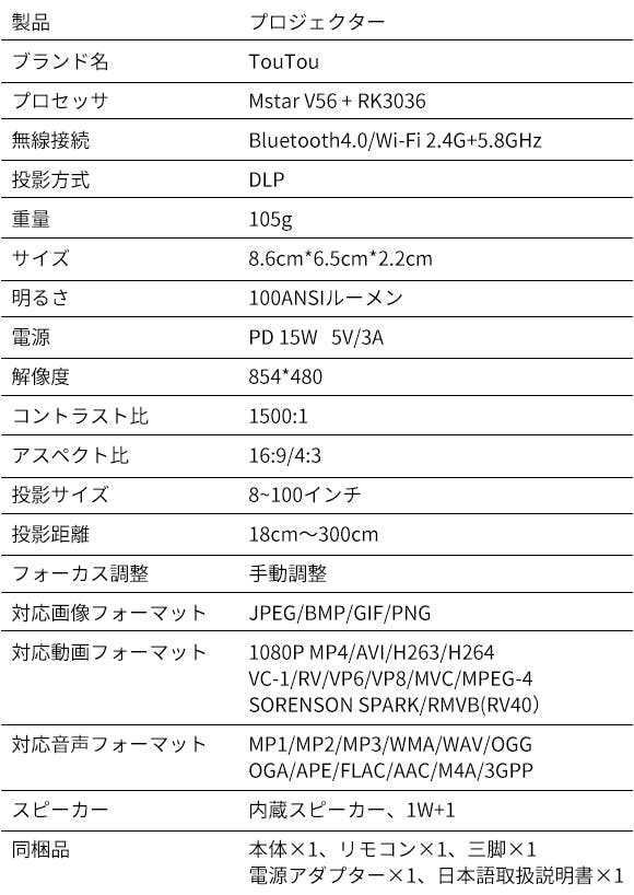 ●105gの軽さ&8.6cm*6.5cmサイズで最大100インチの映像出力。