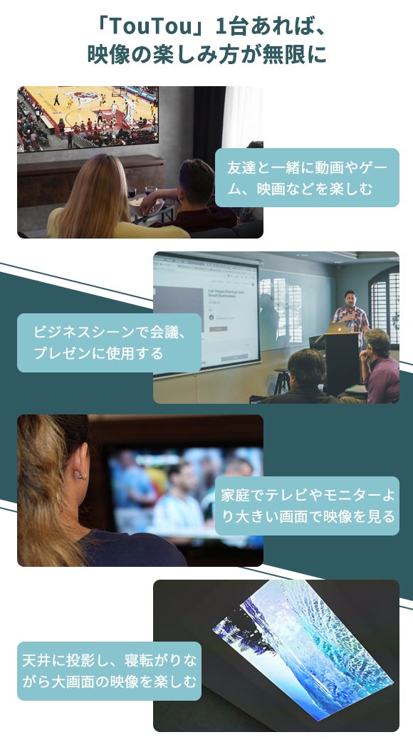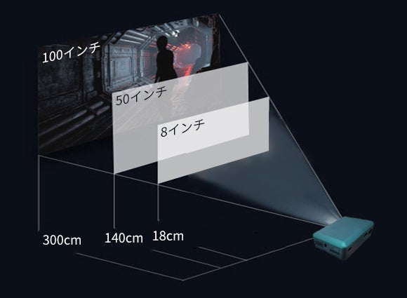 TouTouは18cm~300cmまでの広い距離で投影でき、設置位置や部屋のレイアウトに関係なく迫力のある映像を鑑賞できます。ワンルームや狭めの部屋など限られたスペースでも大画面で映像が楽しめます。