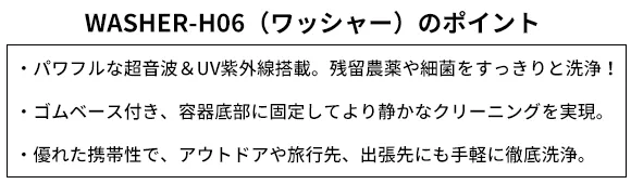 WASHER-H06は高速振動や衝撃で微生物の細胞の塊を破壊すると同時に、UV紫外線ライトの照射によって菌細胞の光化学反応を起こして菌を除去できます。手洗いや用具などで洗う場合より安全で手間も省けます。