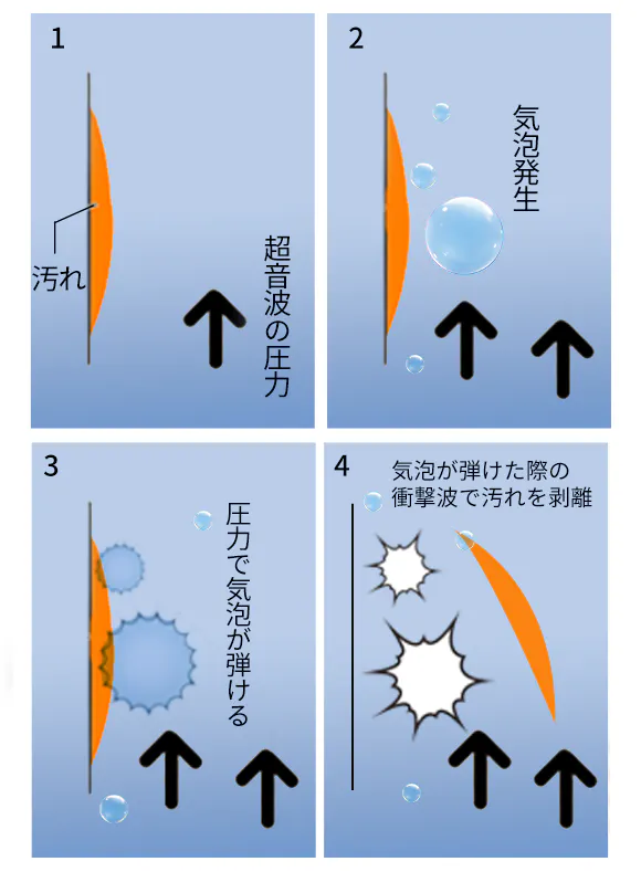 超音波による振動で液体中の空気と水分を分離して気泡を形成させ、その気泡が弾ける瞬間に生じる衝撃波が、細かい隙間に溜まった汚れや残留農薬をすっきり取り除きます。
