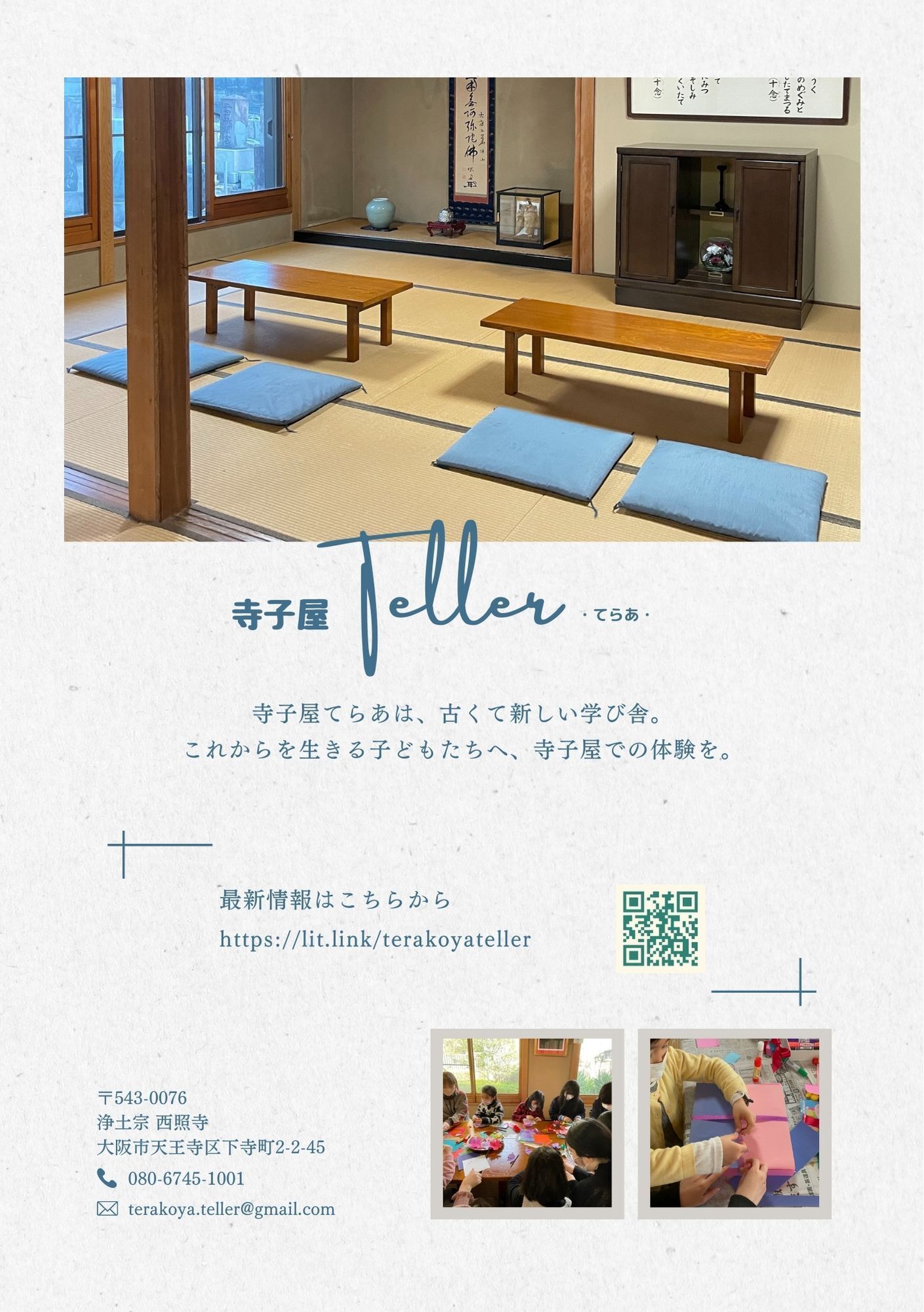 2023/04/01 21:50皆さま、こんにちは!寺子屋てらあはクラウドファンディングでたくさんの方にご支援をいただき、4月より無事リニューアル開校いたしました。コンセプトは、「古くて新しい学び舎」寺子屋てらあは2021年10月より、「学びや遊びに没頭できる空間を創ることで、日常をオモシロくする社会へ」を活動理念にスタートしました。将来の社会に役立つ、直結した勉強を強いられることが多い世の中。子どもたち自身の考え、感覚、気になってること、実はやってみたいことは置き去りにされていないでしょうか。自分の生きる毎日をオモシロくするための「学び」や「遊び」であることを忘れてはなりません。寺子屋では、学びや遊びに没頭できる空間を創ることで、子どもたちが自ら日常を充実させられる世の中にしたいという思いで活動を続けてまいりました。開校当初は0人だった参加者が、1人2人と増え、嬉しいことに今ではたくさんの子どもたちが毎月寺子屋に遊びに来てくれています。今年度からは、数・ことば・探究を軸に、体験を重視したつながりのあるプログラムを作成し、さまざまな大人、企業、地域とのコラボを実現してまいります。また、長期休みには自然体験合宿を企画しており、子どもたちが自然の中で思いっきり遊ぶ時空間をつくることで、子どもたち一人ひとりの「私の世界」を大切に育みます。何よりも子どもたちに届けたいのは「生きている実感」。子どもたちにとっての大切な子ども時代のひとかけらに、寺子屋での時間をプレゼントできたらなと思っています。たくさんの方々に支えていただき、この寺子屋を進化させていけることを大変うれしく思います。心より感謝申し上げます。これからも応援をよろしくお願いいたします。寺子屋スタッフ一同ーーーーーーーーーーーー寺子屋てらあのSNSアカウントにて日々の様子を発信してまいりますので、ぜひご登録をよろしくお願いいたします!寺子屋てらあリンク集 もっと見る