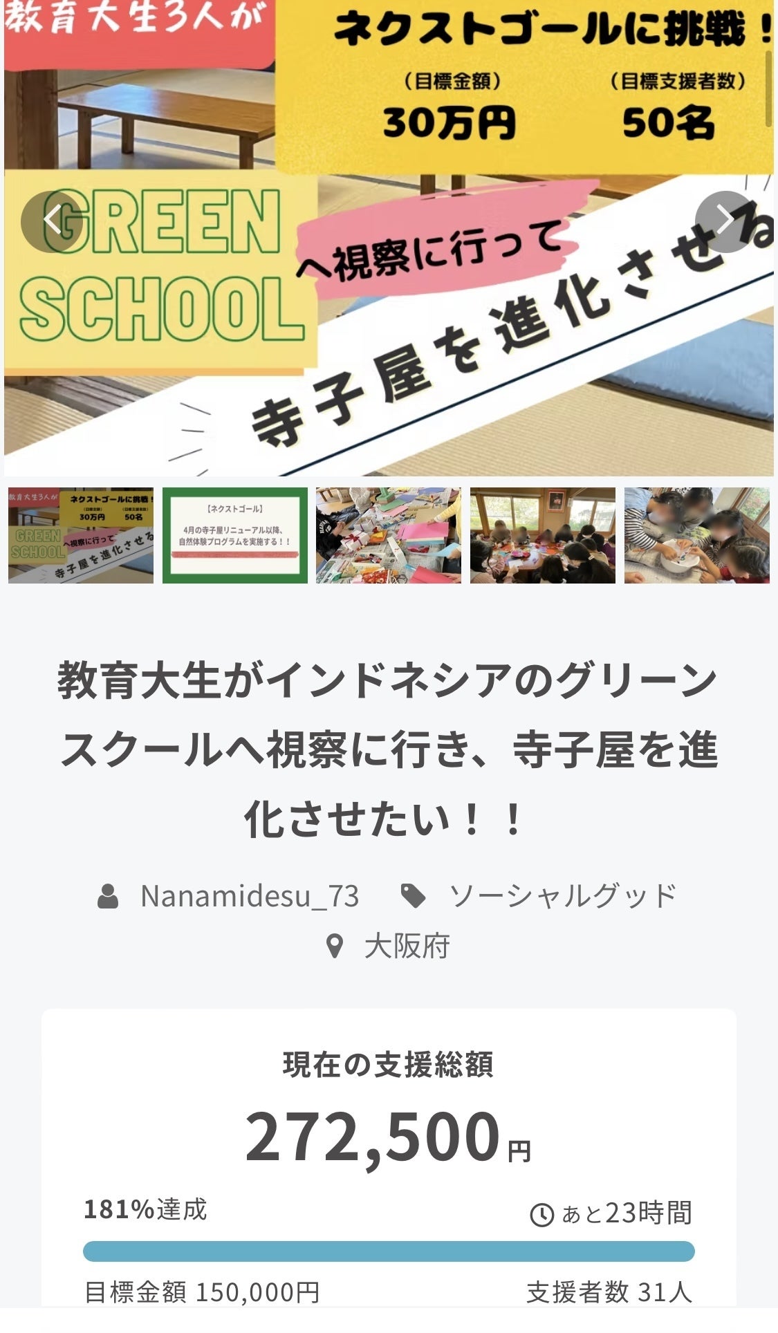 皆さま、こんにちは!寺子屋てらあ代表の堀内菜々美です。皆さまからのクラウドファンディングのご支援で、とびっきりの自然体験プログラムを実施することができましたので、ご報告させていただきます。(1日目)10月16日、参加者みんなで大阪駅に集合し、バスに乗って出発!バスレクは教育大のスタッフが考え、大盛り上がり。今回の自然体験プログラム、舞台は「三重県紀北町」。ここは海、山、川、すべてが美しく、自然を味わえる素敵なまちです。写真にある「けいちゅう」は、もともとあった中学校をリノベーションして宿泊施設になった場所。今回はここで子どもたちと一泊しました。紀北町に到着して最初のアクティビティは、海釣り体験!初めて釣りをする子も多く、現地の人のお話を真剣に聞きながら釣りを楽しんでいました。「釣れたー!!」という声があちこちから聞こえて、満面の笑みで釣った魚を見せてくれました。コツをつかんだ高学年の子が低学年の子に、「こうするといいよ!」と優しくアドバイスする姿も。雨が降ってきたので、釣りが終わった後は宿泊施設にある体育館で思いっきり遊びました。ここではあえてスタッフから遊びを決めることはせずに体育館に向かうと、たちまち子どもたち自身で体育館にあるものを使って遊びを決めて、ルールを決めて楽しんでいました。たくさん遊んだ後は、夕食のカレーづくり。施設内にある家庭科室を利用して、自分たちの食べる夜ご飯をつくります。安全面には目を配りつつも、始めからレシピを伝えることはせず、自分たちでつくってねと伝えました。「何からすればいいんだっけ?」とドギマギしつつも、カレーを作ったことがある子が、「まずは野菜から切り始めよう」と言い、なんとか自分たちで完成させました。その横では、現地の方が釣れた魚を持ってきてさばいてくださりました。子どもたちが釣った魚も唐揚げに!自分たちでつくった夜ごはんはおいしかったようで、おかわりする子がたくさん!ごはんを食べてお風呂に入ったあとは、お部屋で遊んだり、おしゃべりをしたり。たくさん遊んで疲れたのか、スタッフが想像していたよりもすぐに寝静まっていました。(笑)(2日目)こどもたちの朝はとても早く、スタッフはたたき起こされました...!朝ごはんを食べた後は、紀北町のまちを散歩しに出かけました。すっかり晴れて、海も美しく、子どもたちは大はしゃぎ。「散歩」のはずが、1人、2人、と靴を脱ぎ、足、ひざ、太もも、と濡れていき...全員思いっきり海と遊んでいました。まさかの全員びしょ濡れで帰ってくるとは...!!まさかの全員びしょ濡れ事件で、宿泊施設に戻ってきて、大急ぎでシャワーをしました。(笑)そんなこんなでドタバタな午前中を過ごした後は、バスに乗って、奇跡の川と言われる「銚子川」に向かいました。到着して銚子川を見たとたん、子どもも大人も「うわあ!」と思わず言ってしまうほどの美しさでした。水切りをしたり、日向ぼっこをしたり。川に石を投げるだけの遊びですが、飽きることなくひたすら遊んでいました。続いては、高塚公園展望台。少し山を登った先に、紀北町を一望できる展望台があります。道の途中では、栗を見つけて拾ったり、鳥の鳴き声に耳を傾けたり。展望台からは、さっきまで近くで見て遊んでいた海を遠くから眺めました。紀北町のまちや現地の方々にありがとうを伝え、全員で無事に大阪駅まで戻ってくることができ、自然体験プログラムは終了しました。(最後に)今回の「寺子屋てらあ 秋の自然体験ツアー2023秋」の企画・実施を通して、たくさんの学びや喜びがありました。本来は夏休みに実施する予定だったのですが、直前に台風で延期となり、10月の実施までにたくさんの方々に支えていただきました。宿泊先のスタッフの方、現地の住人の方々、道の駅の食堂の方、バス会社の方々、寺子屋スタッフの仲間たち、その他にもたくさんの方々とともに、どうしたらより充実した体験を子どもたちへ届けられるか、たくさん相談して実現させることができました。1泊2日を思いっきり楽しんでくれた子どもたちへも感謝です。保護者の方から、「週末に家族で釣りに行くようになりました。」「魚を食べるようになりました。」「すごく楽しそうに三重での体験を話してくれました。」など、たくさんのメッセージをいただき、実施できてよかったと心から思います。最後に、あらためてクラウドファンディングのご支援をいただいた皆さま、ありがとうございます。これからも皆さまと、子どもたちの大切な子ども時代の体験をつくっていけたらと思います。今後とも寺子屋てらあをよろしくお願いいたします。堀内