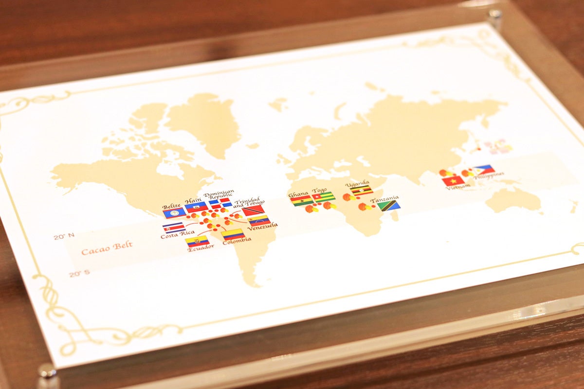 それは、わたしたちにとって無くてはならないチョコレート原料「カカオ」の生産農家さんに日々想いを馳せ、感謝の気持ちを持ち続けるために、常に目に入る場所に世界地図を掲げているからです。