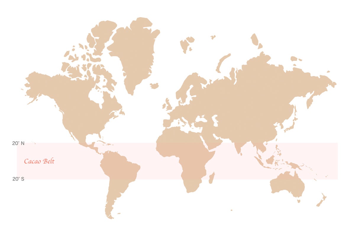 赤道を中心に南北20度までがカカオ栽培に適した地域で「カカオベルト」と呼ばれる