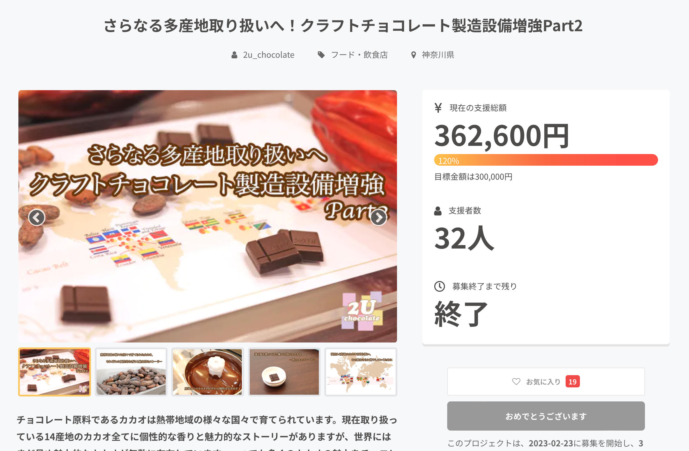 2023/04/11 12:001ヶ月強にわたり実施してきた設備増強のための本プロジェクト、4/9(日)に無事募集を終了しました。皆さまの温かなご協力のおかげで、最終的に第一目標の120%を超えるご支援をいただくことができました。ご支援いただいた皆さま、拡散にご協力いただいた皆さまに改めて感謝申し上げます。これからリターンのお届け準備に入り、5月初旬以降に順次お届けしていきます。進捗状況については個別のメッセージでもご連絡いたしますので、適宜ご確認いただけますと幸いです。2U chocolate は4月から新たな営業体制になり、今回の設備変更も含めて、この1年は様々な変化を加えていく予定です。最新の情報は公式HPやTwitter、Instagramで発信していますので、時折気にかけていただけますと嬉しいです。今後ともよろしくお願いいたします! もっと見る