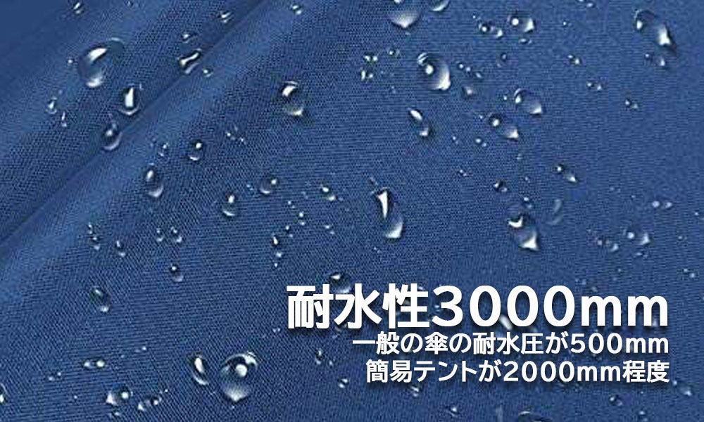 テントの生地が雨露に浸透しないことを示す耐水圧は3000mm!高いレベルで雨水を通しにくい耐水性なので急な雨でも安心できます。