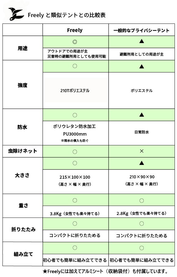 【Freely(フリーリー)】は、アウトドア使用を主目的としながらも、万一の災害時の避難所でもご使用いただけることを想定して開発されました。