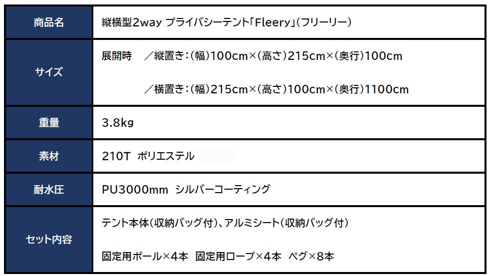 そう思い、生地の強度や防水性、二重構造の窓など改良を重ねてできたのが縦横型2wayプライバシーテント“Freely(フリーリー)”です。“Freely”には「縦横に」と「自由に」という意味があるので、自由自在に、自分の好きなようにという想いを込めています。