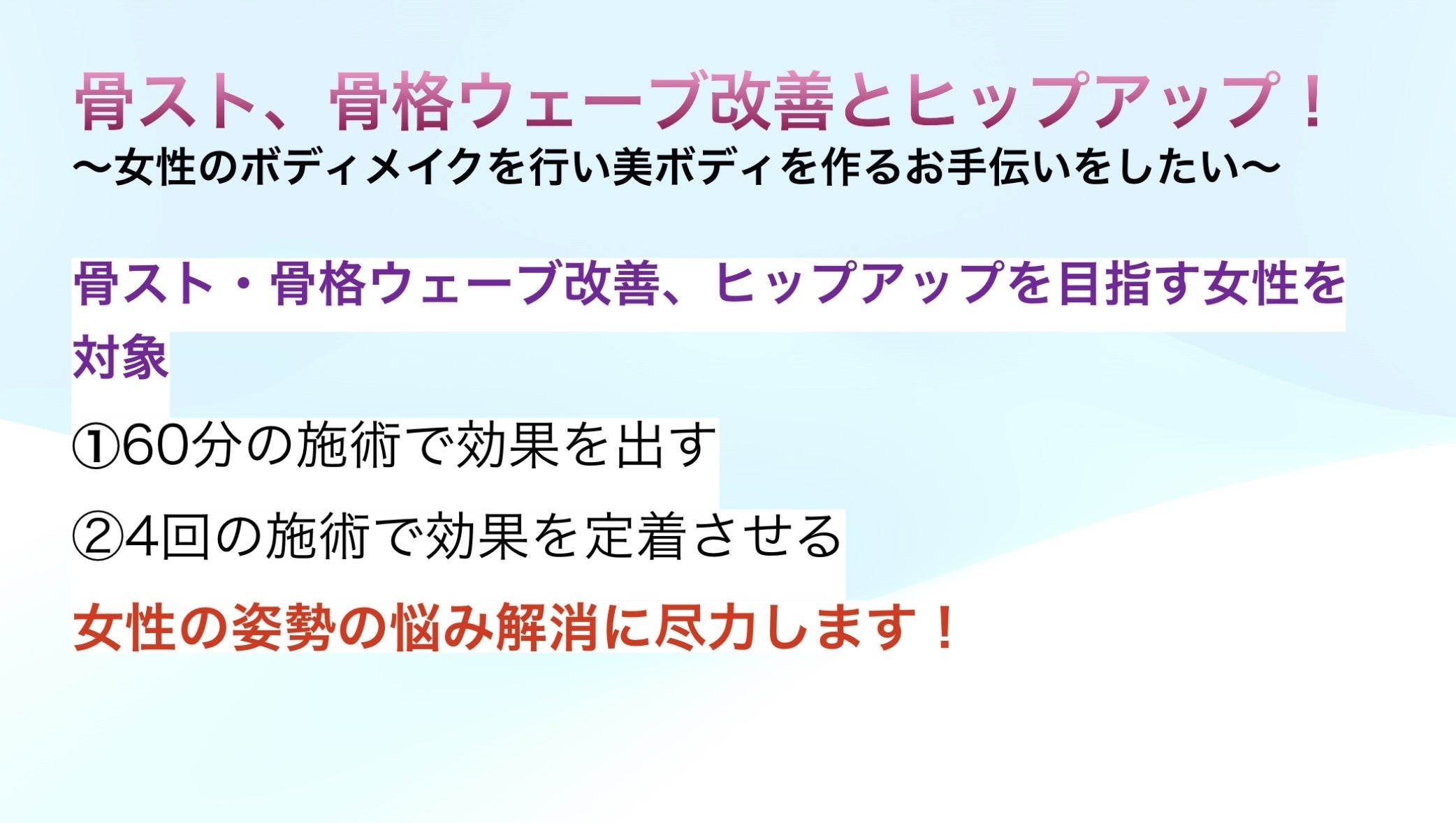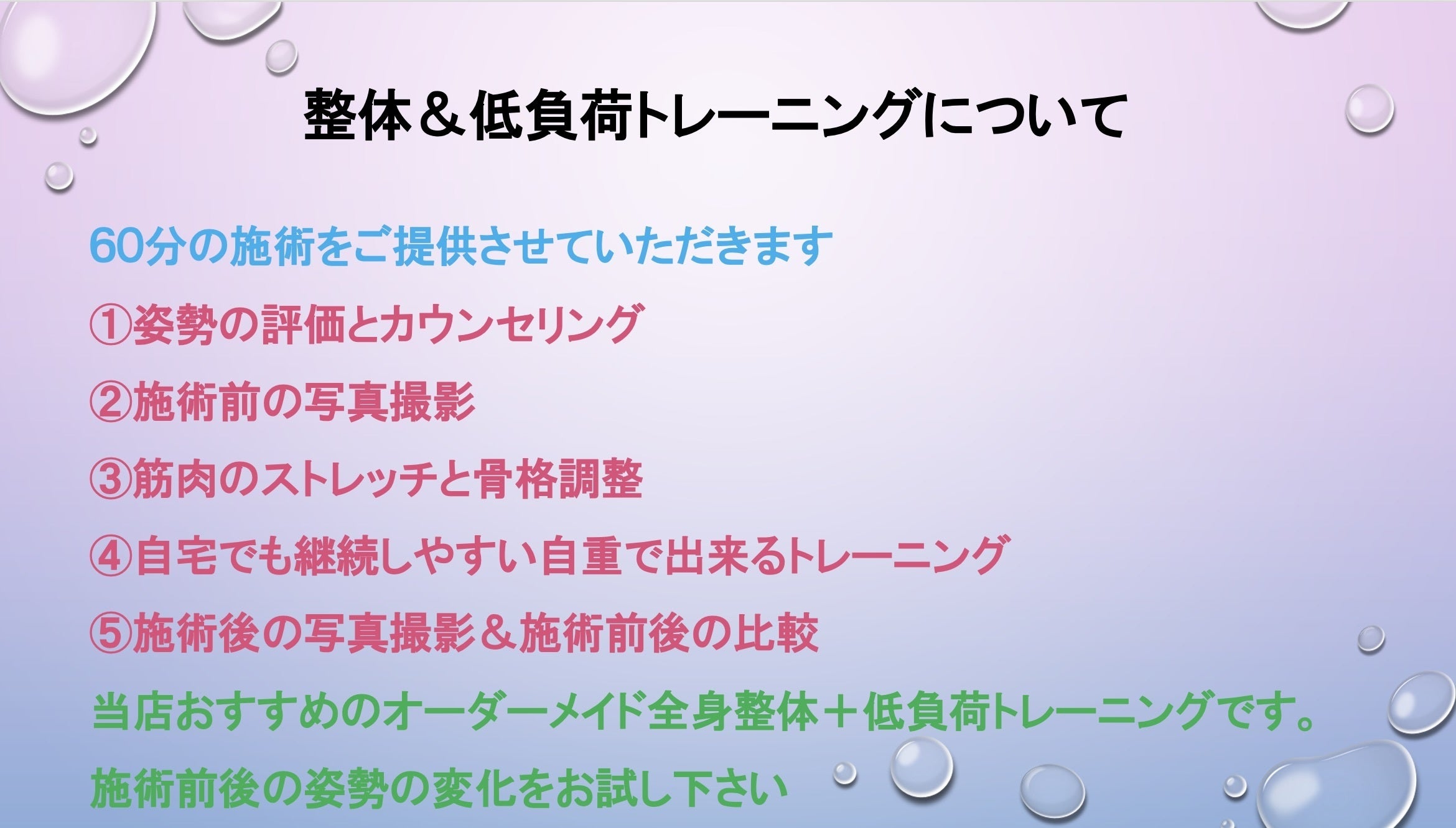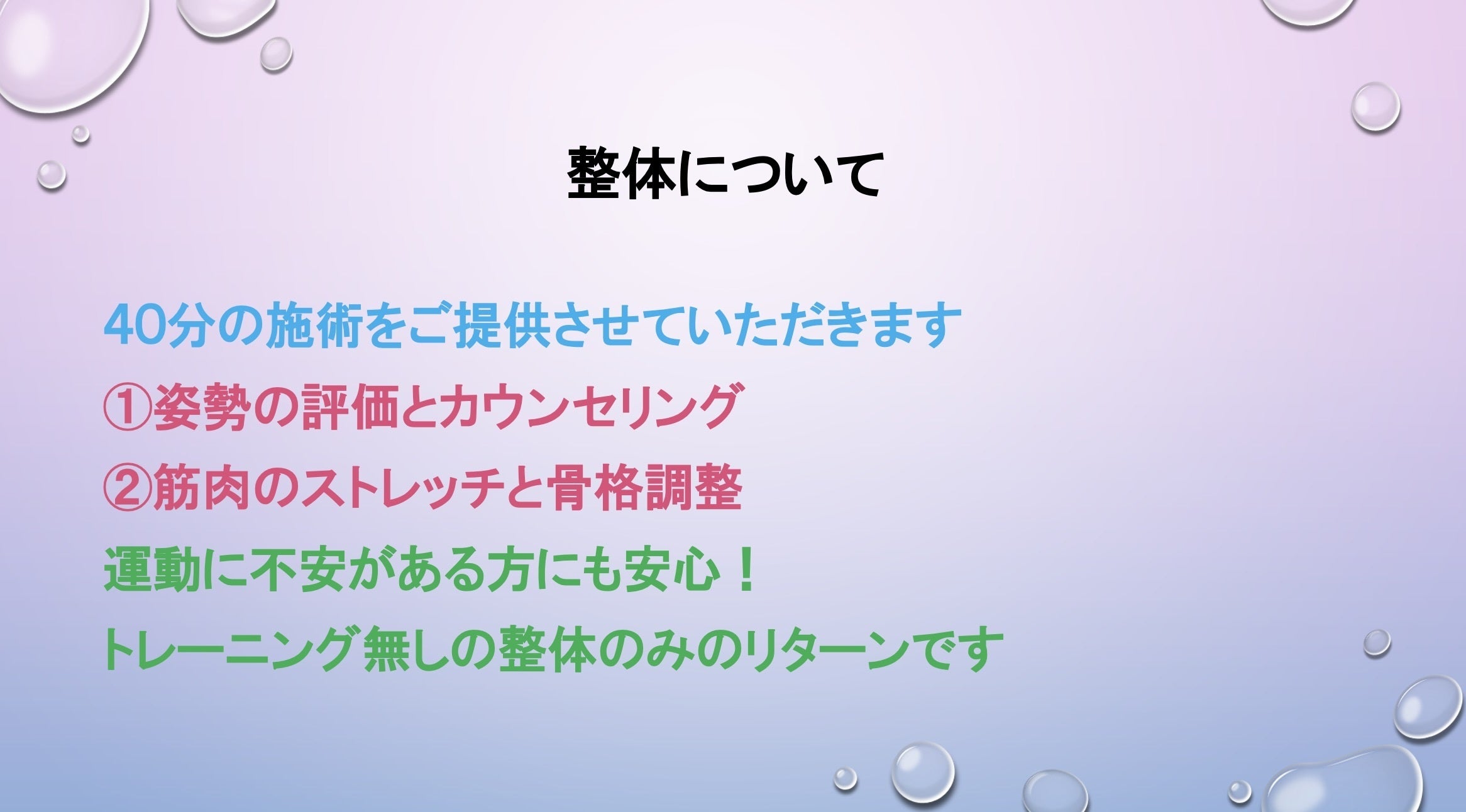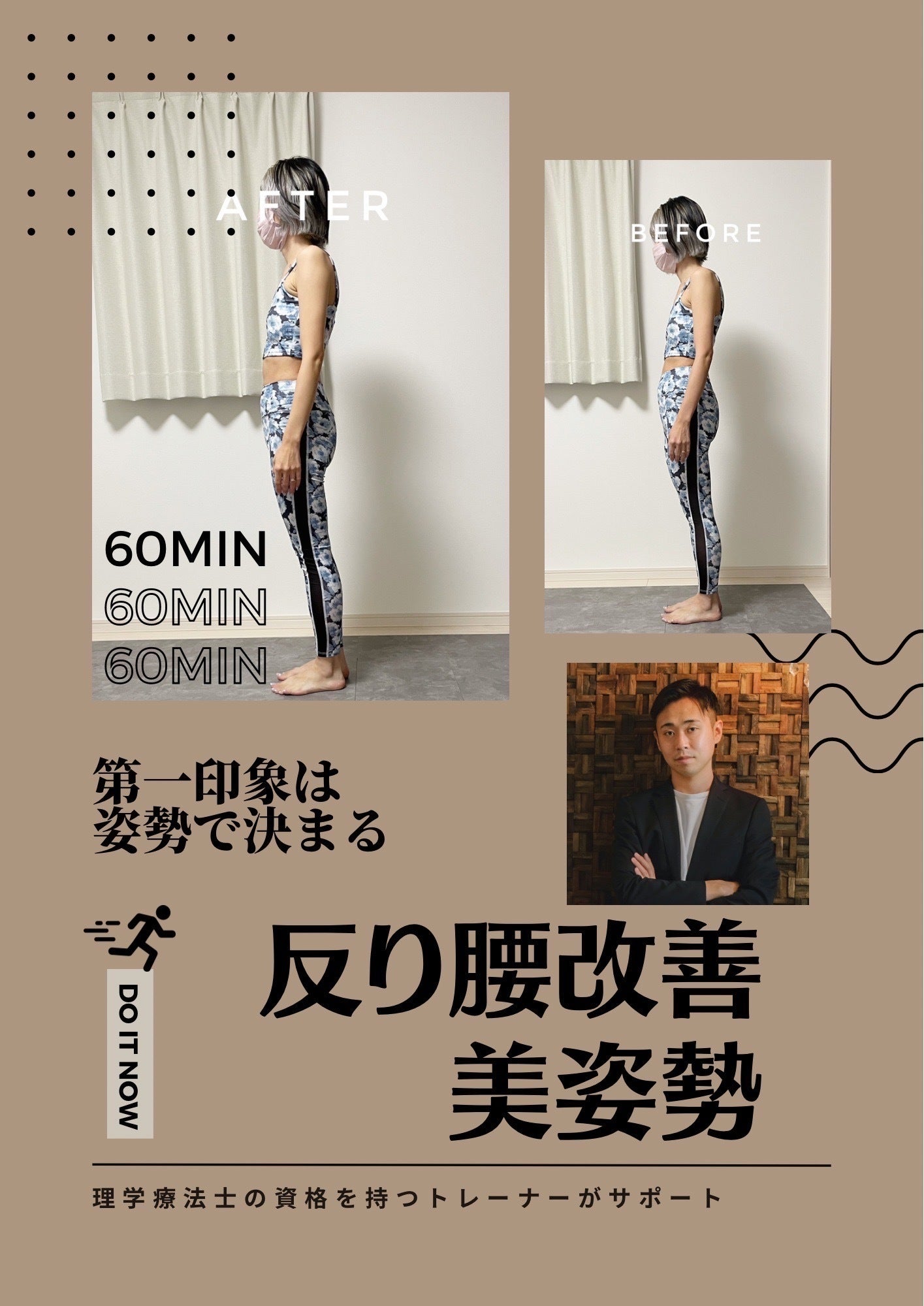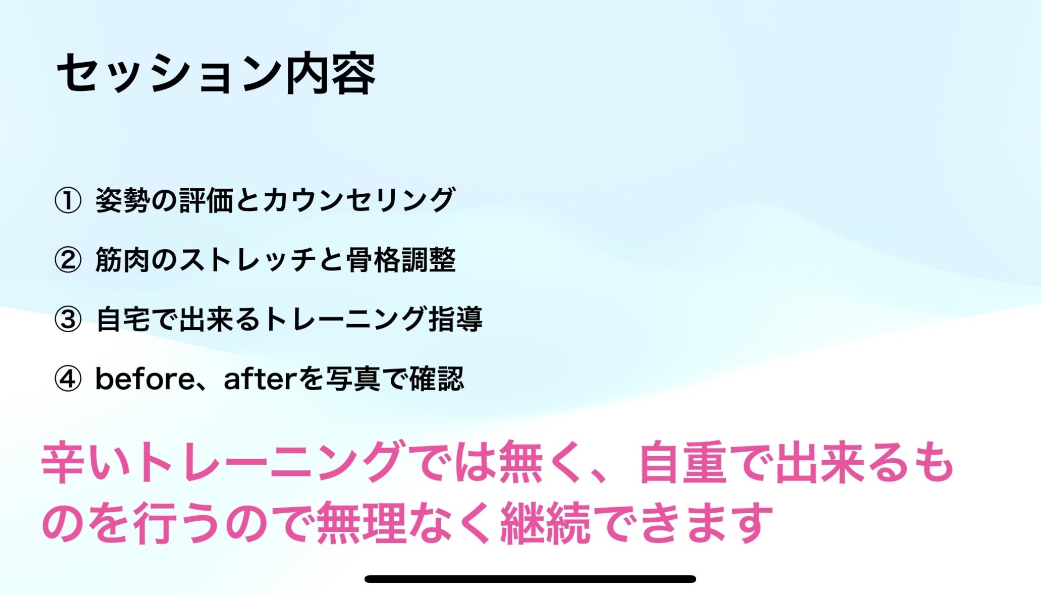 そこで自分のこれまでの経験を活かし、効率的なトレーニングを行なった場合どのように改善するかを60分で示し、モチベーションの維持を図り4回で(概ね1ヶ月)でその効果を定着させ、姿勢の悩みの解決を手伝いたいと思いました。