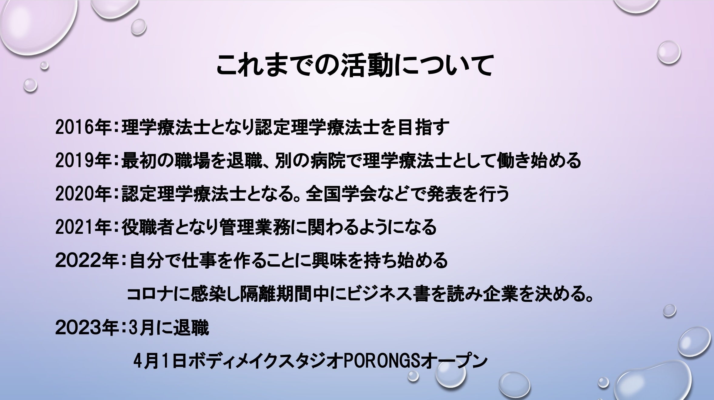 姿勢の悩みを抱える女性が多いのであれば、反り腰や下がったお尻に悩み女性の悩む女性も多いと思い、理学療法士である私が改善のお手伝いをしたいと考えるようになりました。