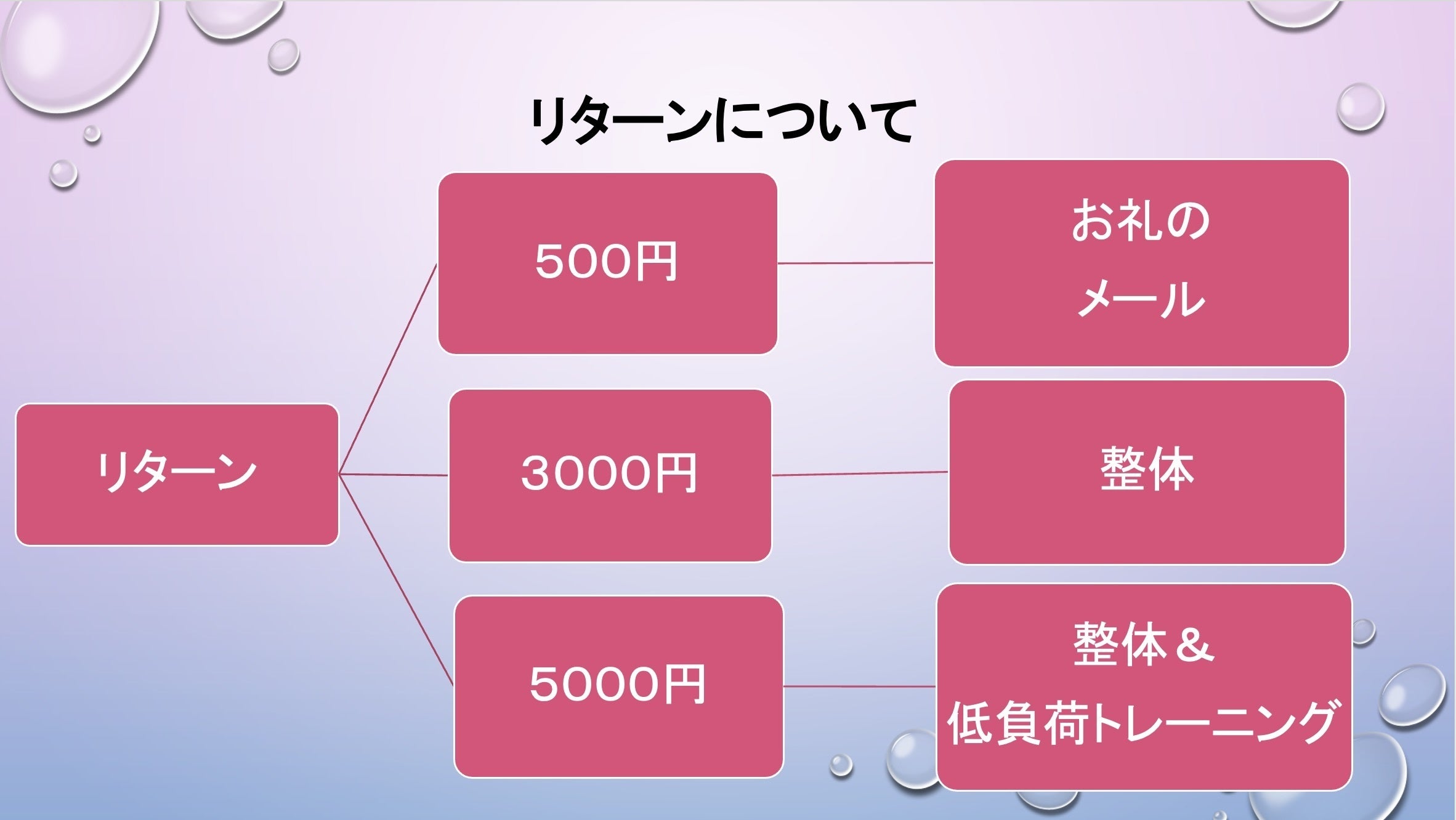 私はこれまで理学療法士として1万人弱の患者さんと接してきました。磨いてきた技術で女性の姿勢の悩みを解決する自信があります。どうか私の夢を応援していただけたら幸いです。皆様からの援助が今後の私の更なる自信と勇気に繋がります。どうかよろしくお願いします。