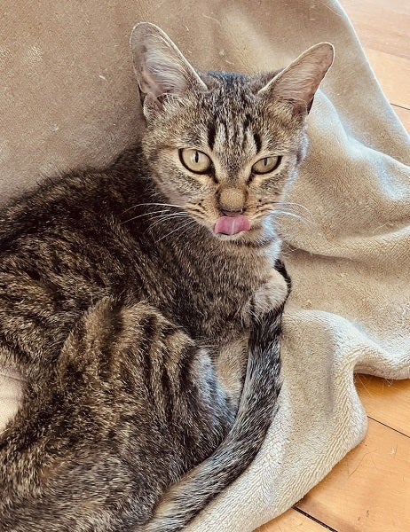 おそらく遺棄された子で、1年近く野良生活を送った後、色々あって当校に入学してきました。とても人懐こいキジトラっ子です。