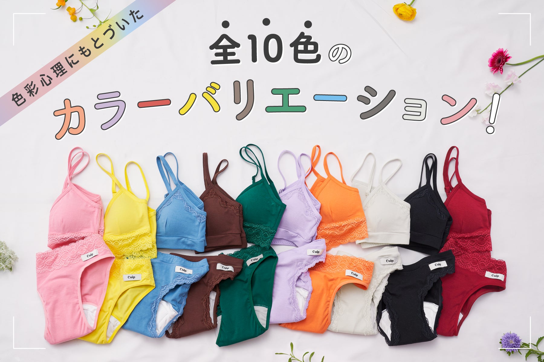 汚れを気にして、暗めの色を選びがちなサニタリーショーツ。でも、そんな時だからこそインナーだけでも気分が上がる色にしてみませんか? Cuipのアイテムは、色彩心理にもとづいた全10色のカラーバリエーションをラインナップ。