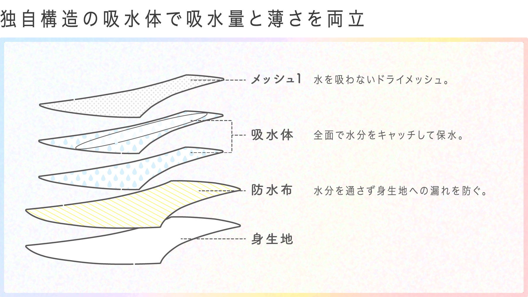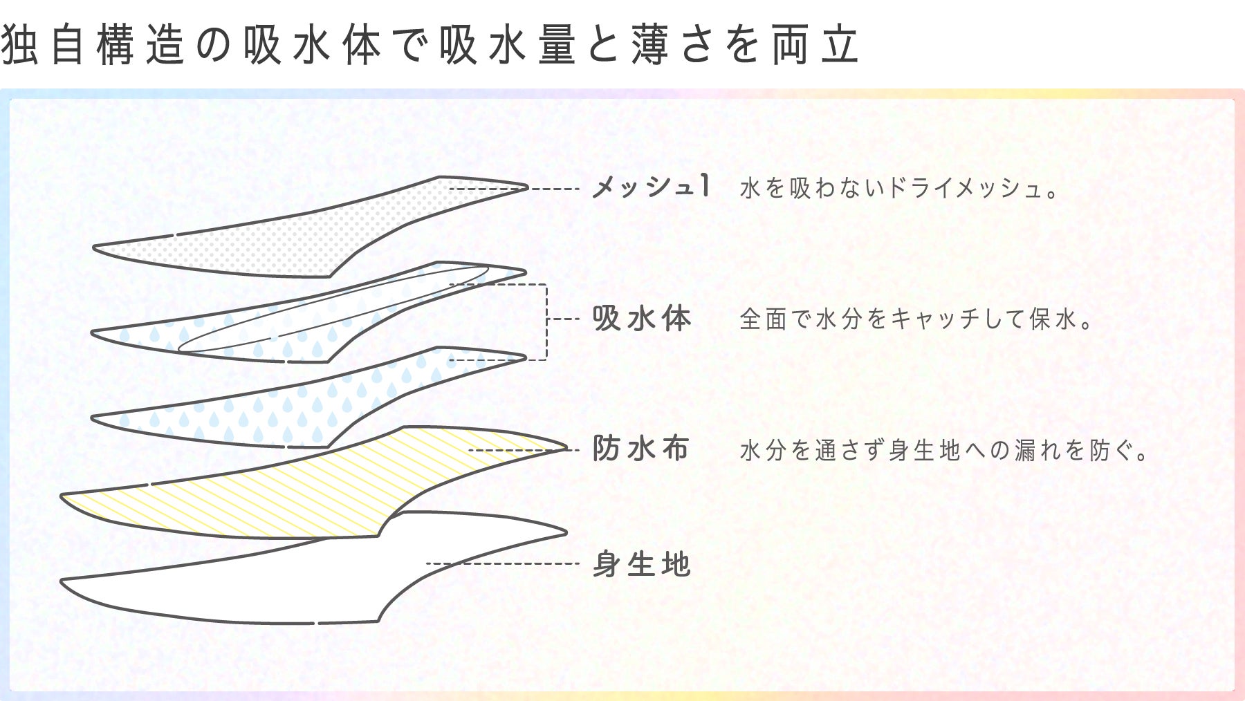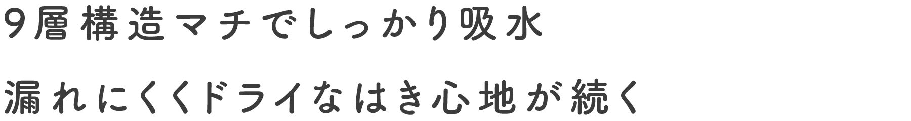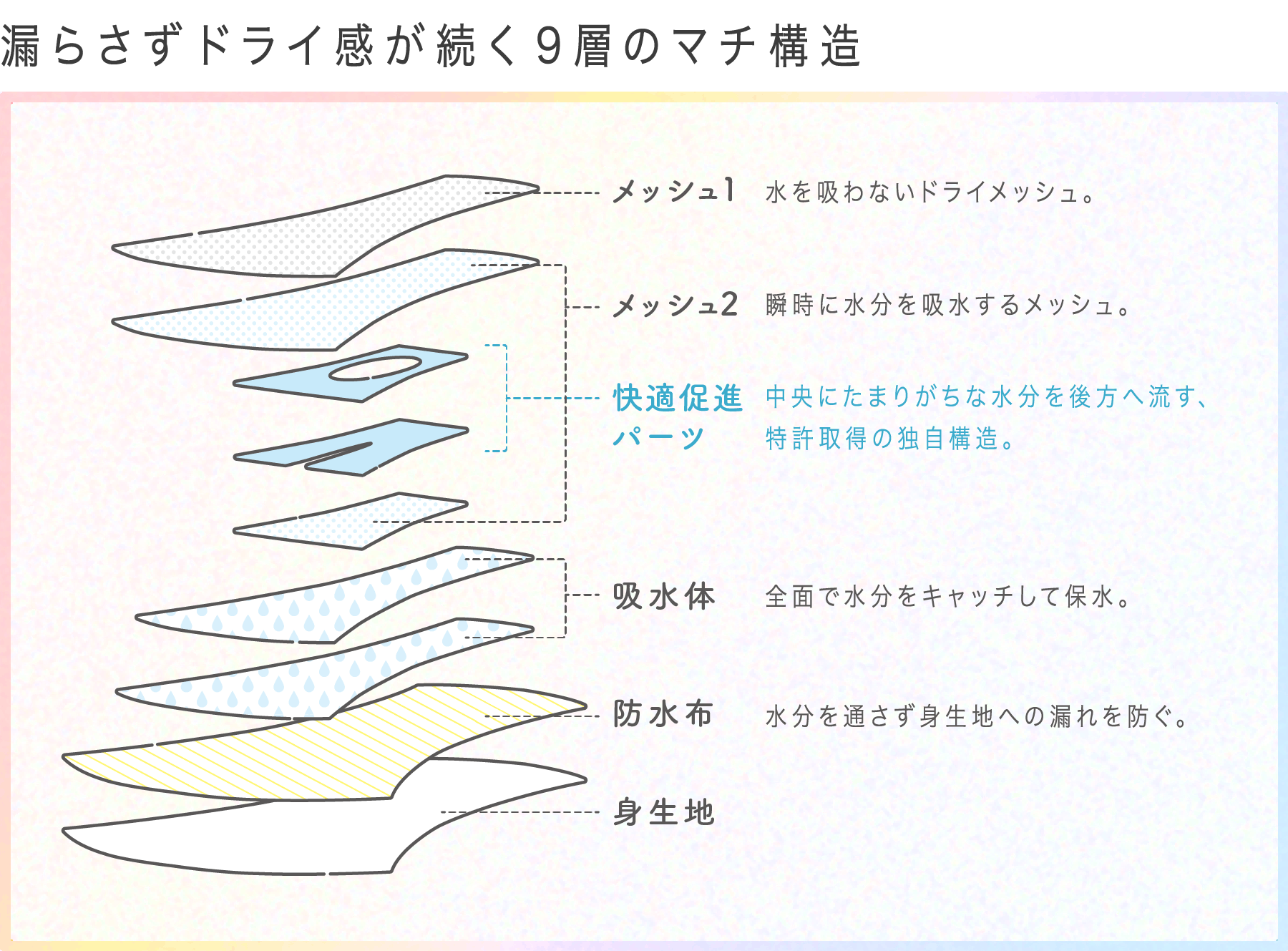 マチ部分は、しっかりとした吸水量とドライなはき心地を追求して、性能の異なる6種の生地を9層に重ねたオリジナル構造。
