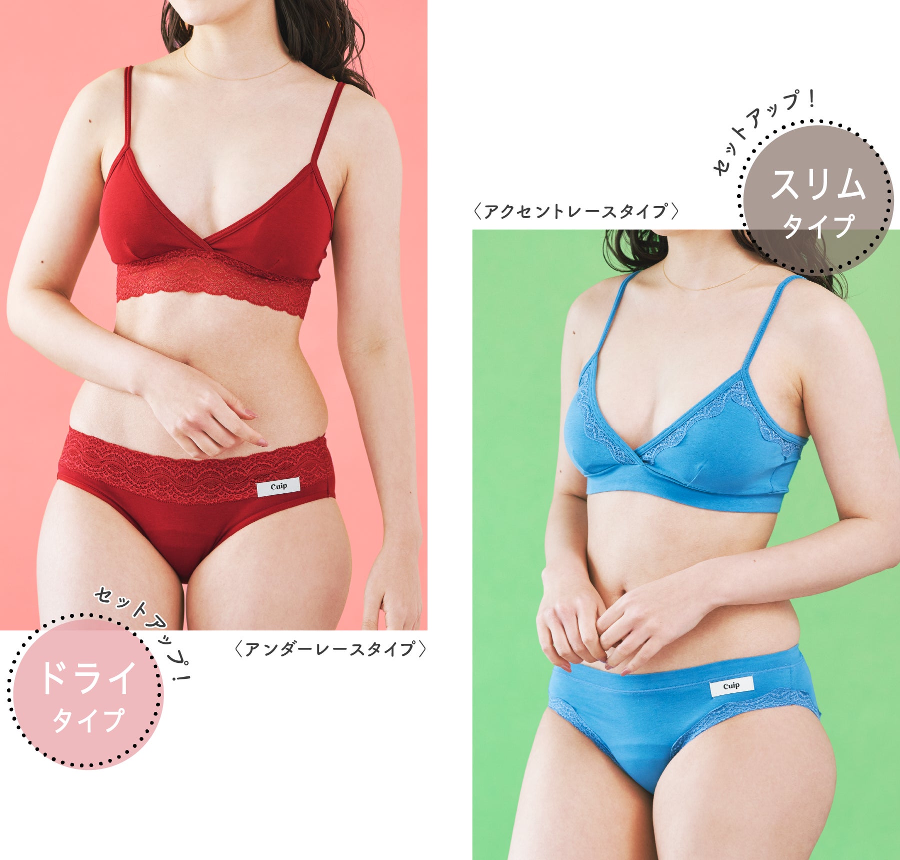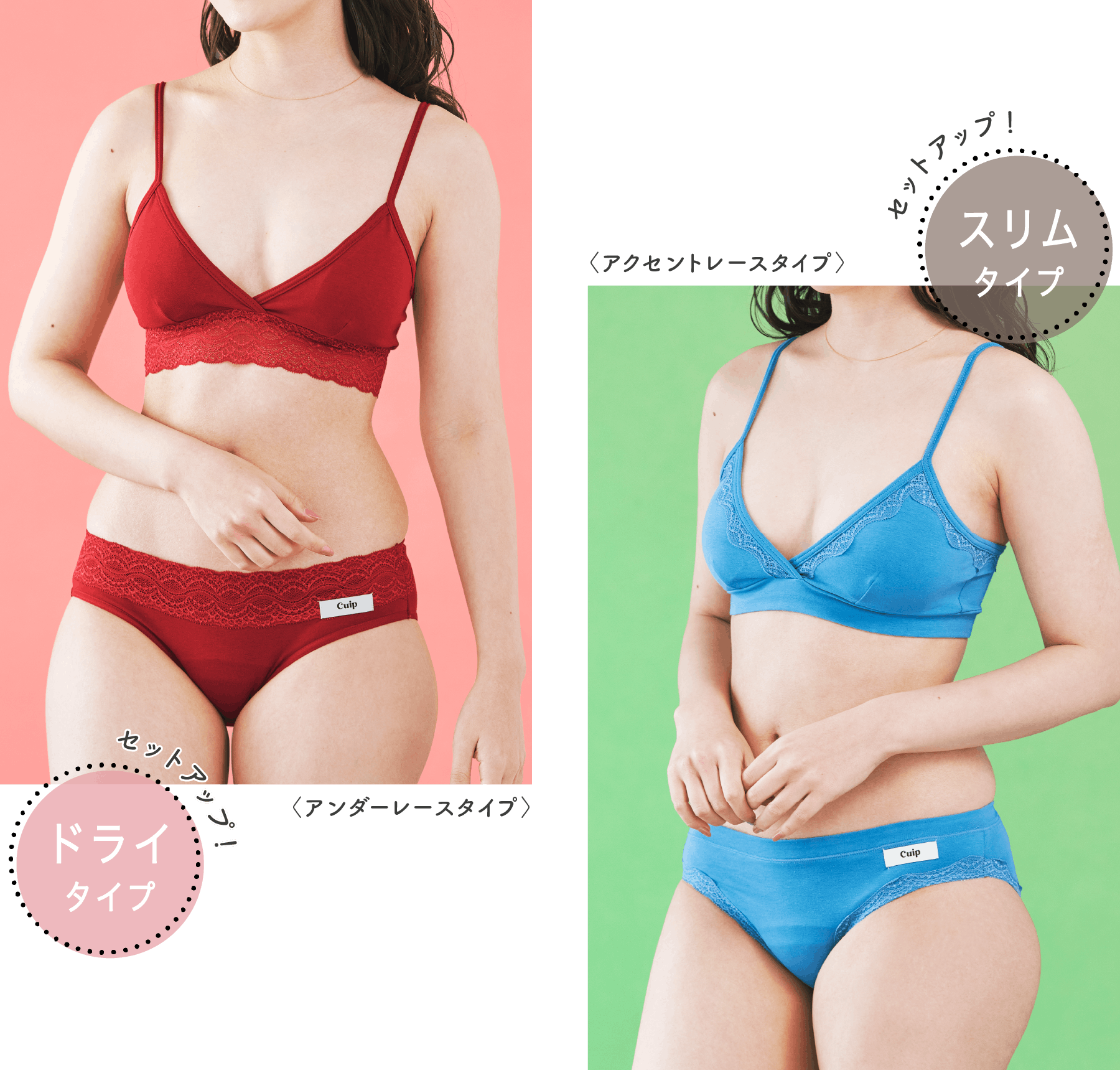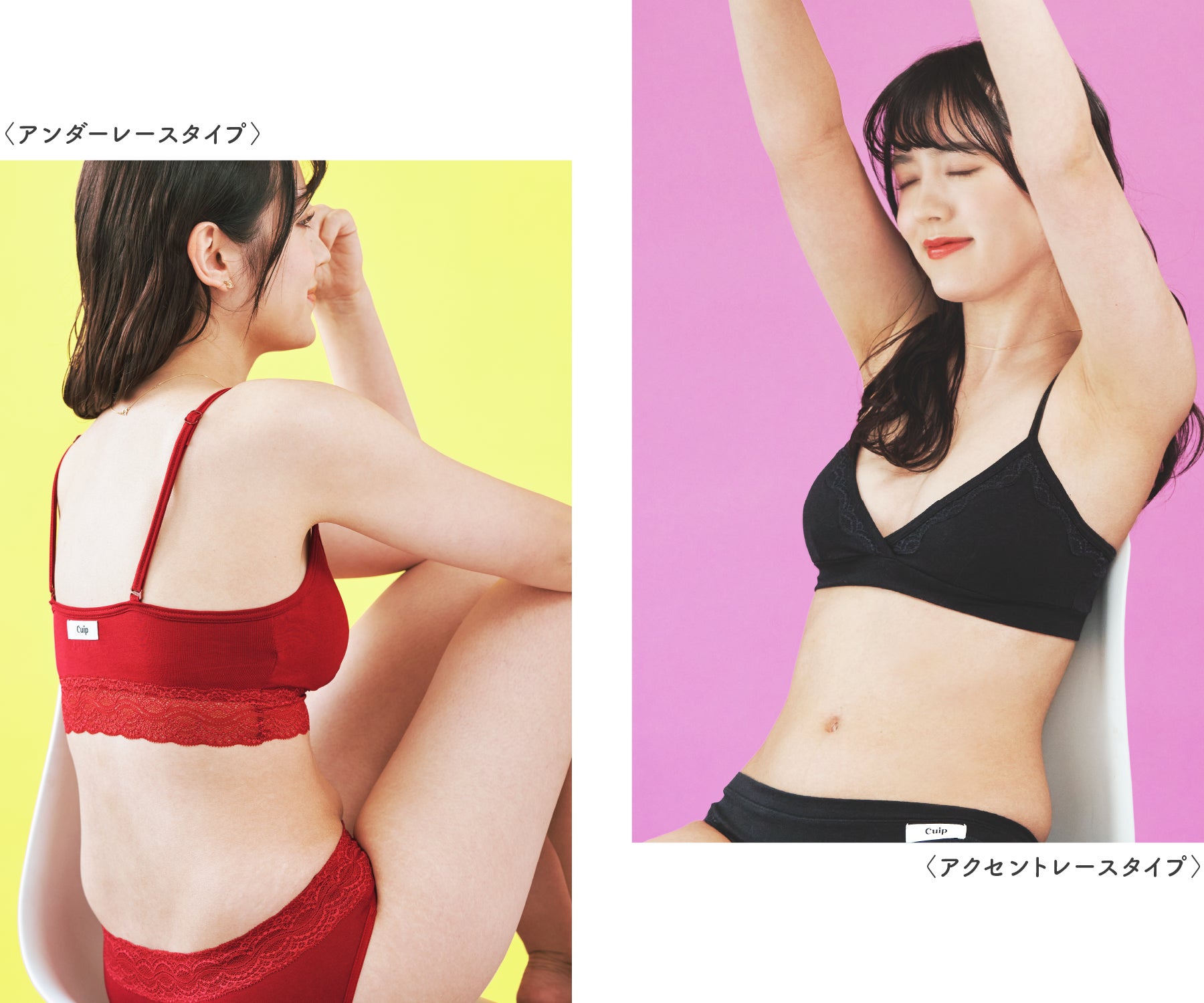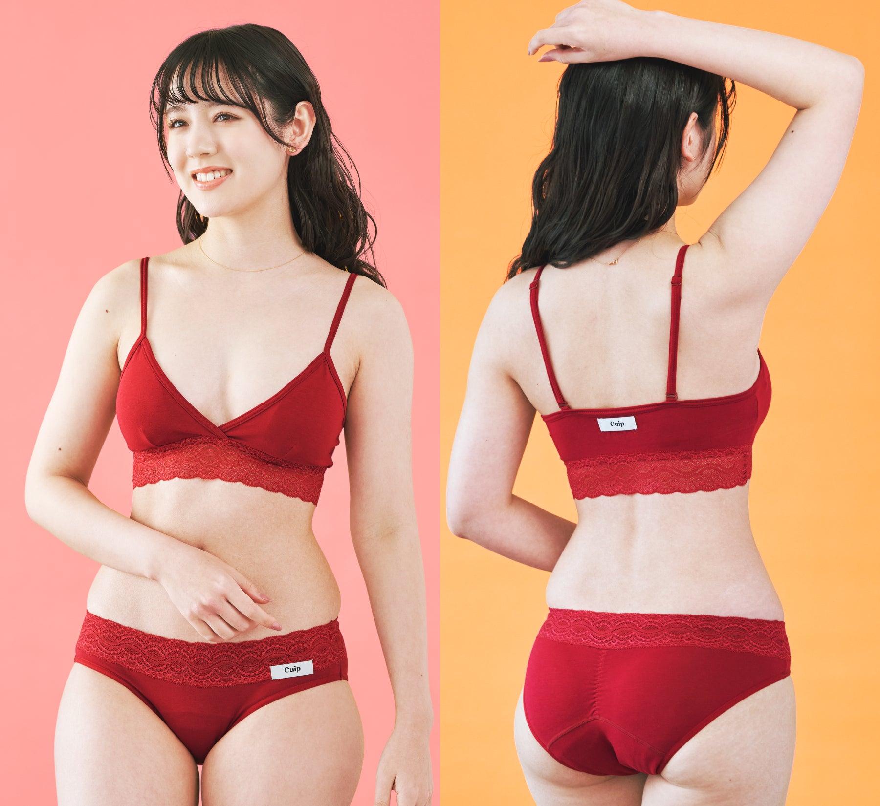 「毎月のあの日はかわいい下着はあきらめてる」「あの日だってインナーの上下を揃えたい」。そんな女性たちの声に耳を傾け、Cuipの第1弾アイテムとしてお届けするのが、吸水ショーツとソフトブラのセットアップ。