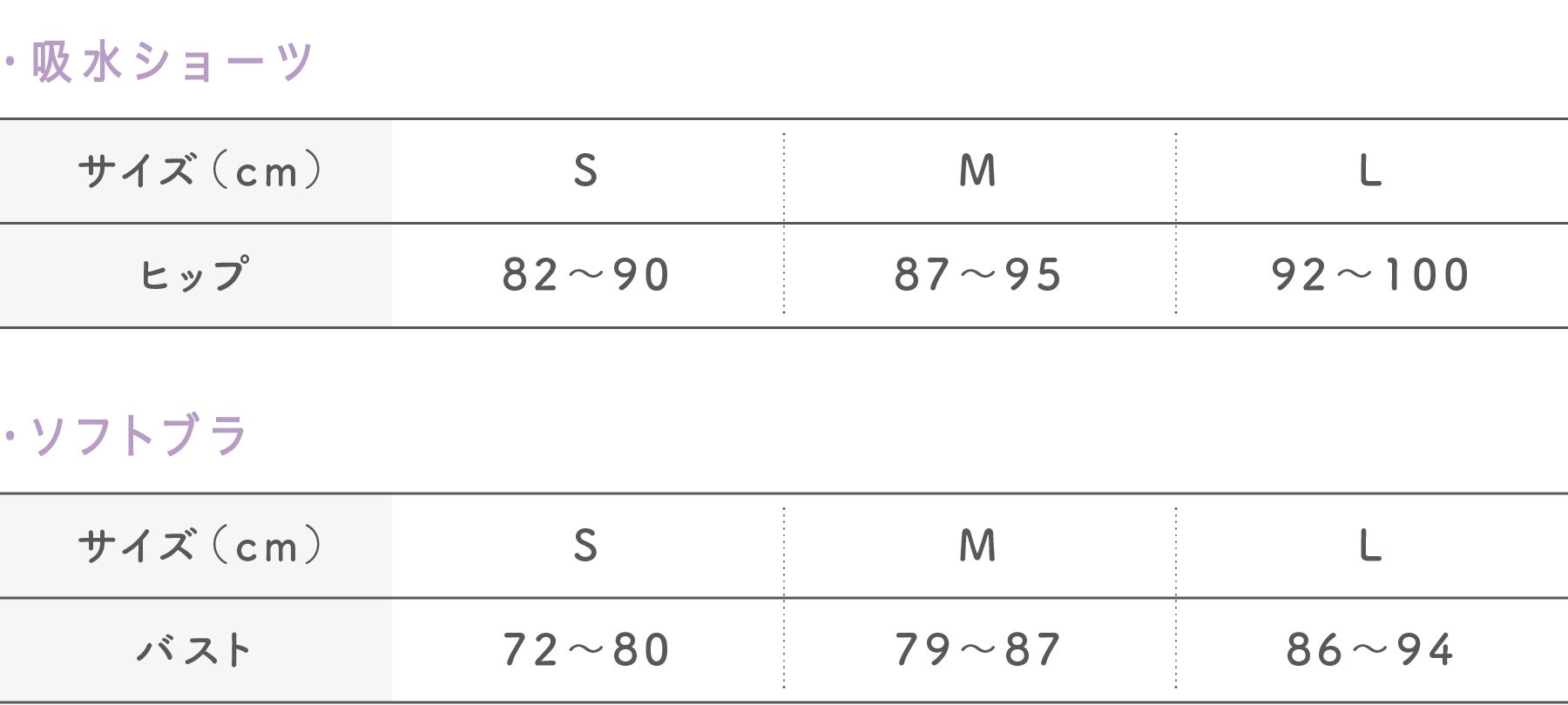 あの日もインナーを揃えられるよう、それぞれの吸水ショーツとデザイン・カラーを揃えた2種のソフトブラをご用意しました。むくみやすい時期の体をいたわれるよう、ワイヤーを使用せず、圧迫感やストレスを感じずに着用できる心地よさを大切にしています。