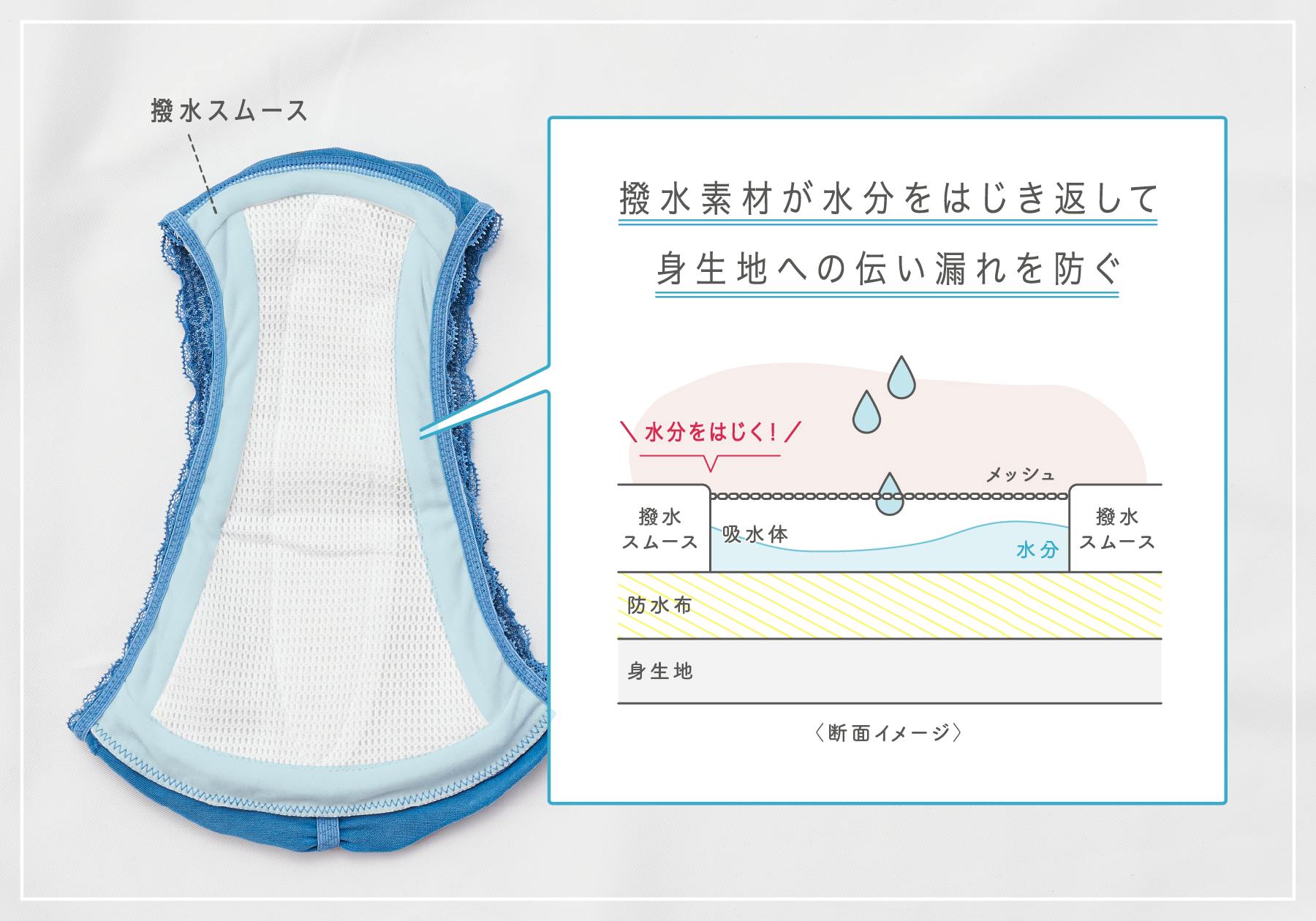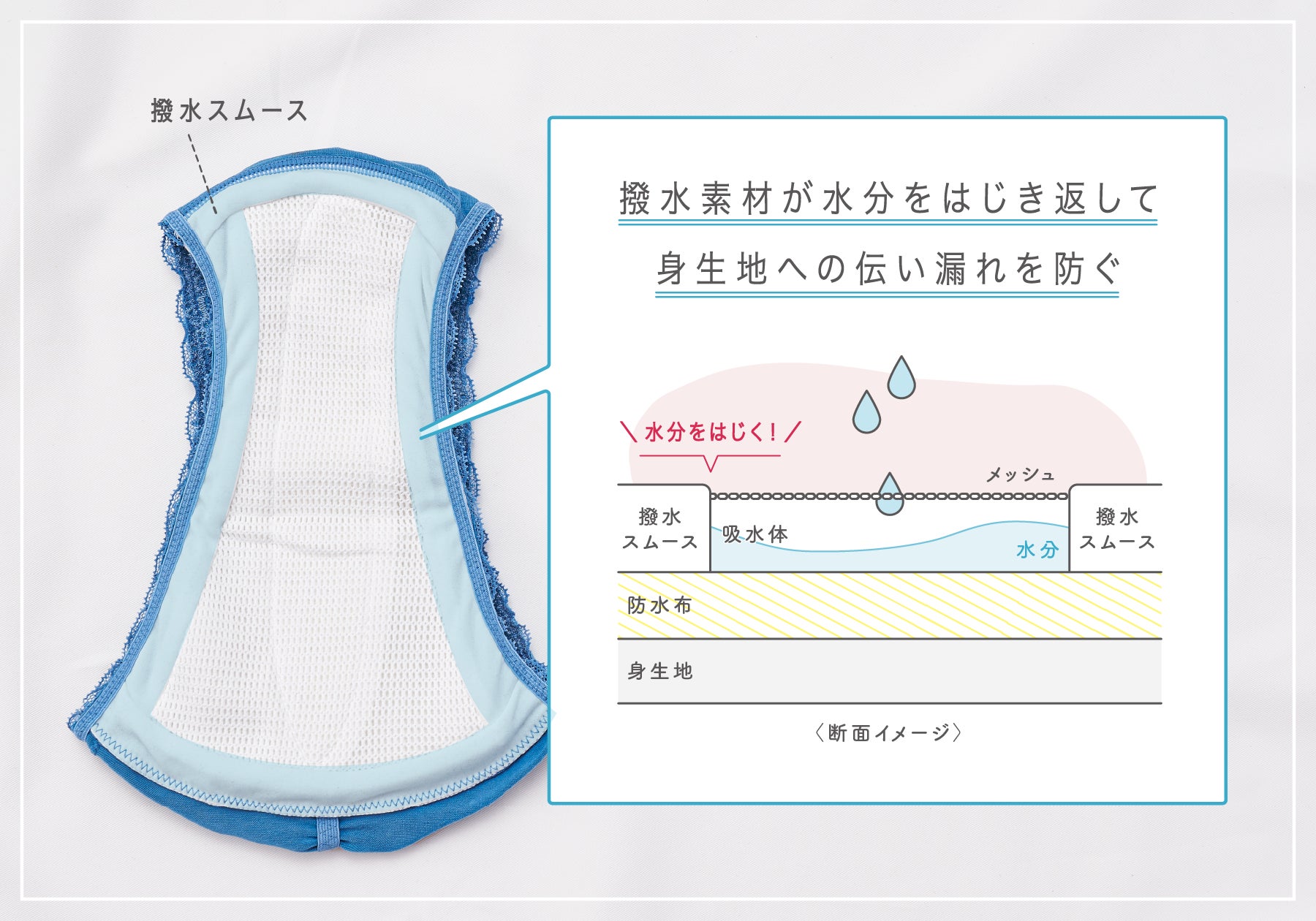 Cuipの吸水ショーツは、マチ部分の四方を撥水素材で囲い、吸収した水分を漏らさない「防波堤構造」を採用。マチで吸収した水分を撥水素材がはじき返して吸水体にとどめることで、身生地への伝い漏れがなく、長時間安心して使用することができます。