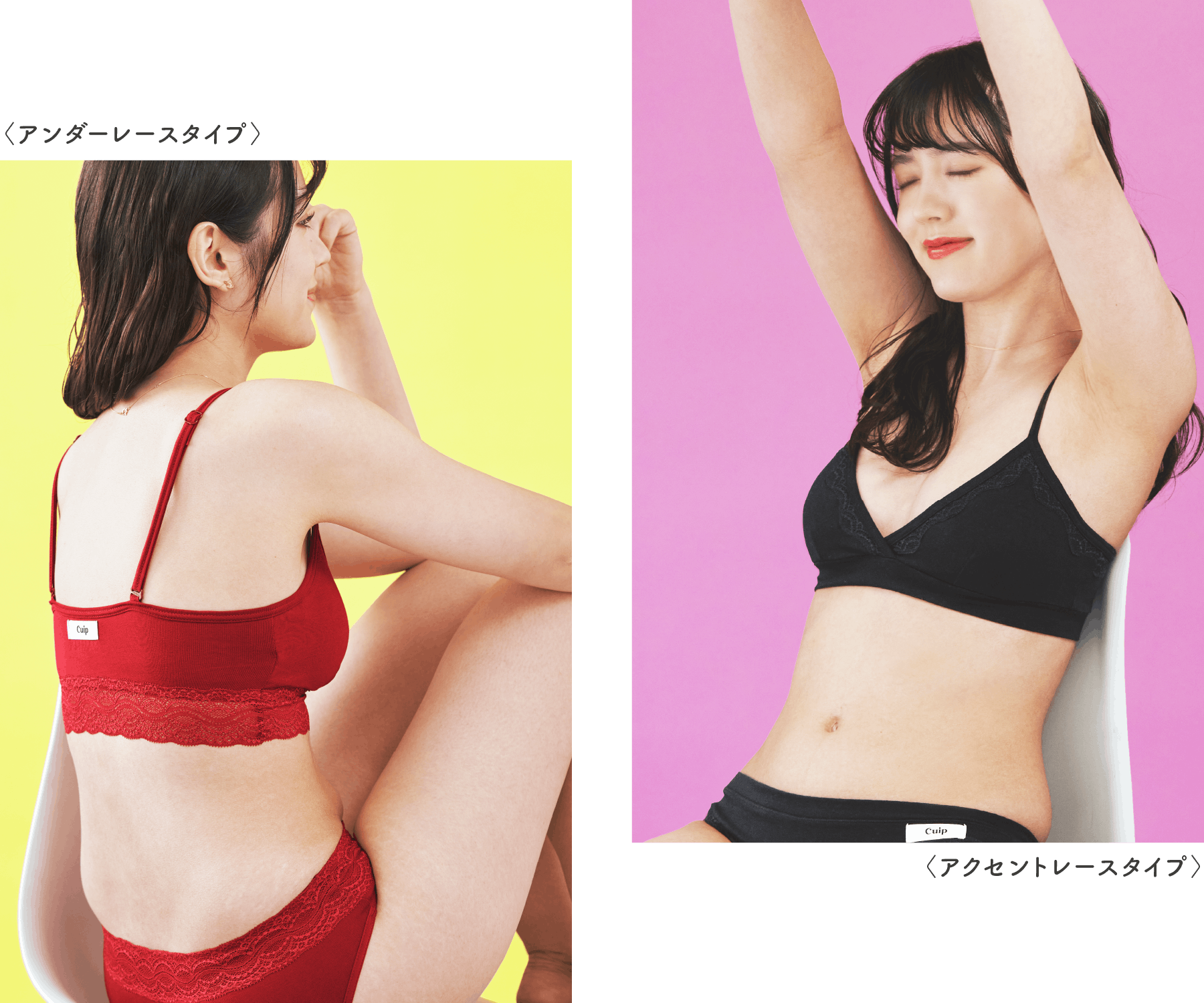さらに、アンダー部分も、〈アンダーレースタイプ〉はレースでくるりと一周し、優しく肌にフィット。〈アクセントレースタイプ〉は伸縮性のあるゴムを身生地で包み、ゴムが肌に直接当たらず締め付けないように。着用時の圧迫感を軽減し、リラックスして着られる設計となっています。