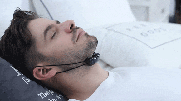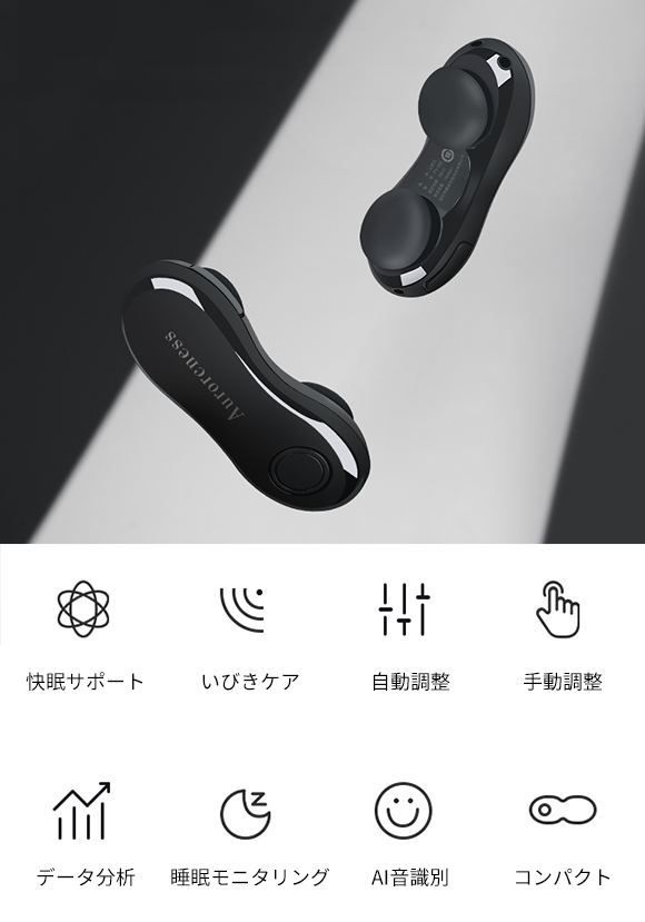 睡眠中に起こるいびきの「音」や喉などが震える「振動」などのデータからいびきが起きたことを正確に検知し、本体から振動刺激を発信することでいびきケアができ、スムーズな呼吸をサポートするデバイスです。