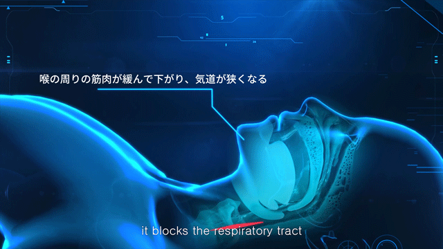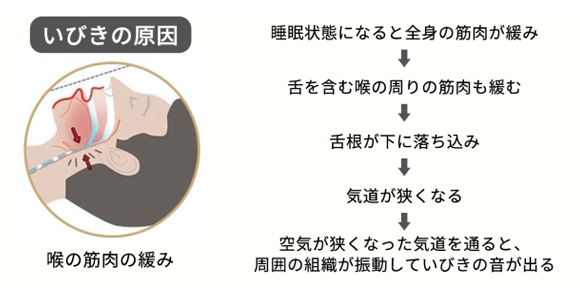 特に仰向けの状態で深い眠りに入った時、喉を支えている筋肉が緩むため、咽頭が狭くなってしまいます。空気が狭い気道が通した時に、周囲の組織が振動し、いびきが発生しやすくなります。