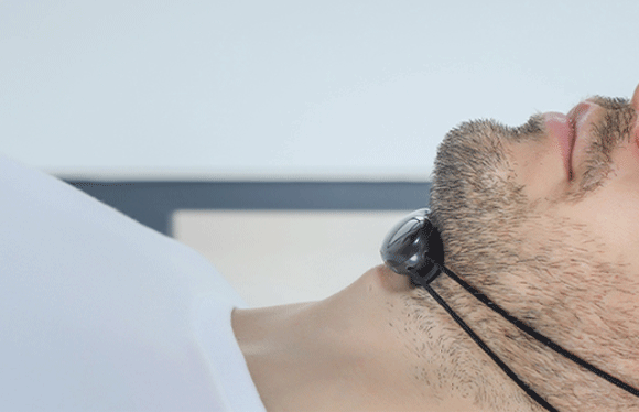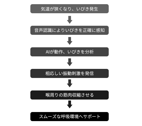 睡眠中に、わずかな喉の振動やイビキの音を感知すると、振動モーターが振動を発信し、喉周りの筋肉を収縮させます。その結果狭くなった気道が振動刺激で開くことで、いびきをしている状態からスムーズな呼吸環境へとサポートし、いびきをケアしてくれます。