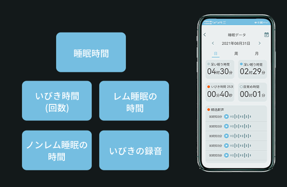 アプリに記録されるデータ内容は、➀睡眠時間、➁いびき時間(回数)、➂レム睡眠の時間、④ノンレム睡眠の時間、⑤いびきの録音の5つのデータです。週や月単位でグラフから状況分析も行えるので、ご自身の変化をしっかりと感じることができます。