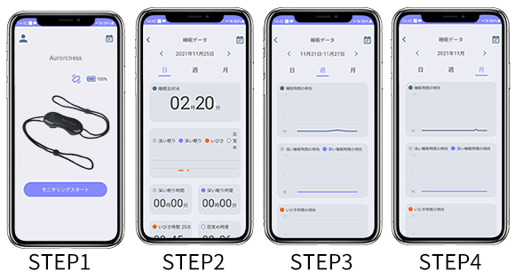 アプリに記録される内容は、時間、パルス振動が機能した回数や、レム/ノンレム睡眠の時間などです。週や月単位での状況分析も行えるので、ご自身の変化をしっかりと感じることができます。