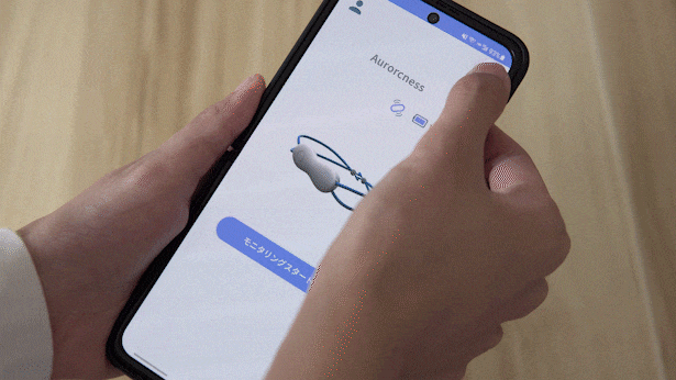 STEP1:Aurorcness Proの電源ボタンを長押しして電源を入れ、スマートフォンのBluetooth機能をONにしてからアプリを立ち上げると、自動でペアリングを開始します。