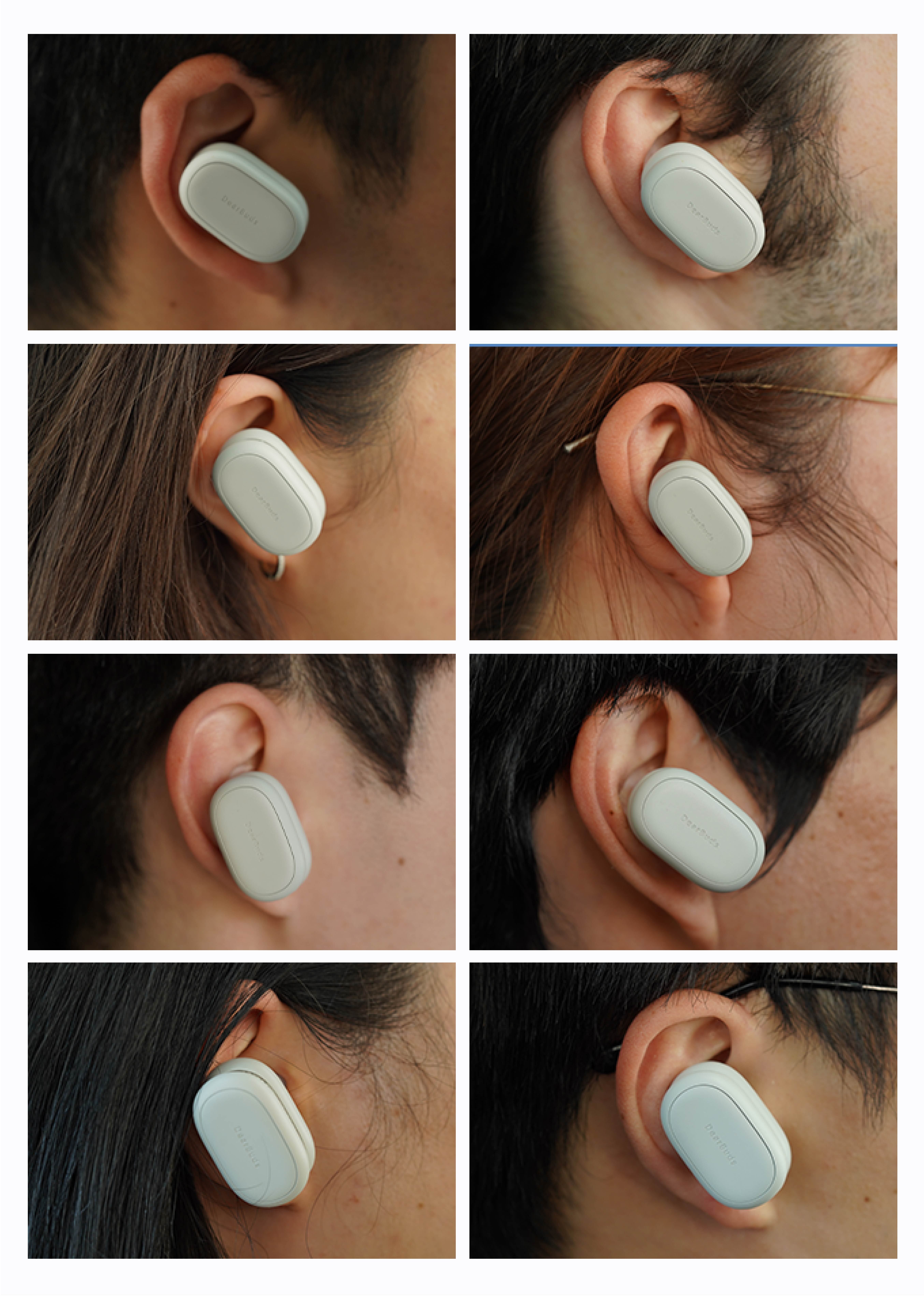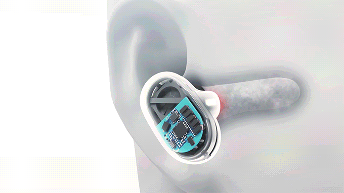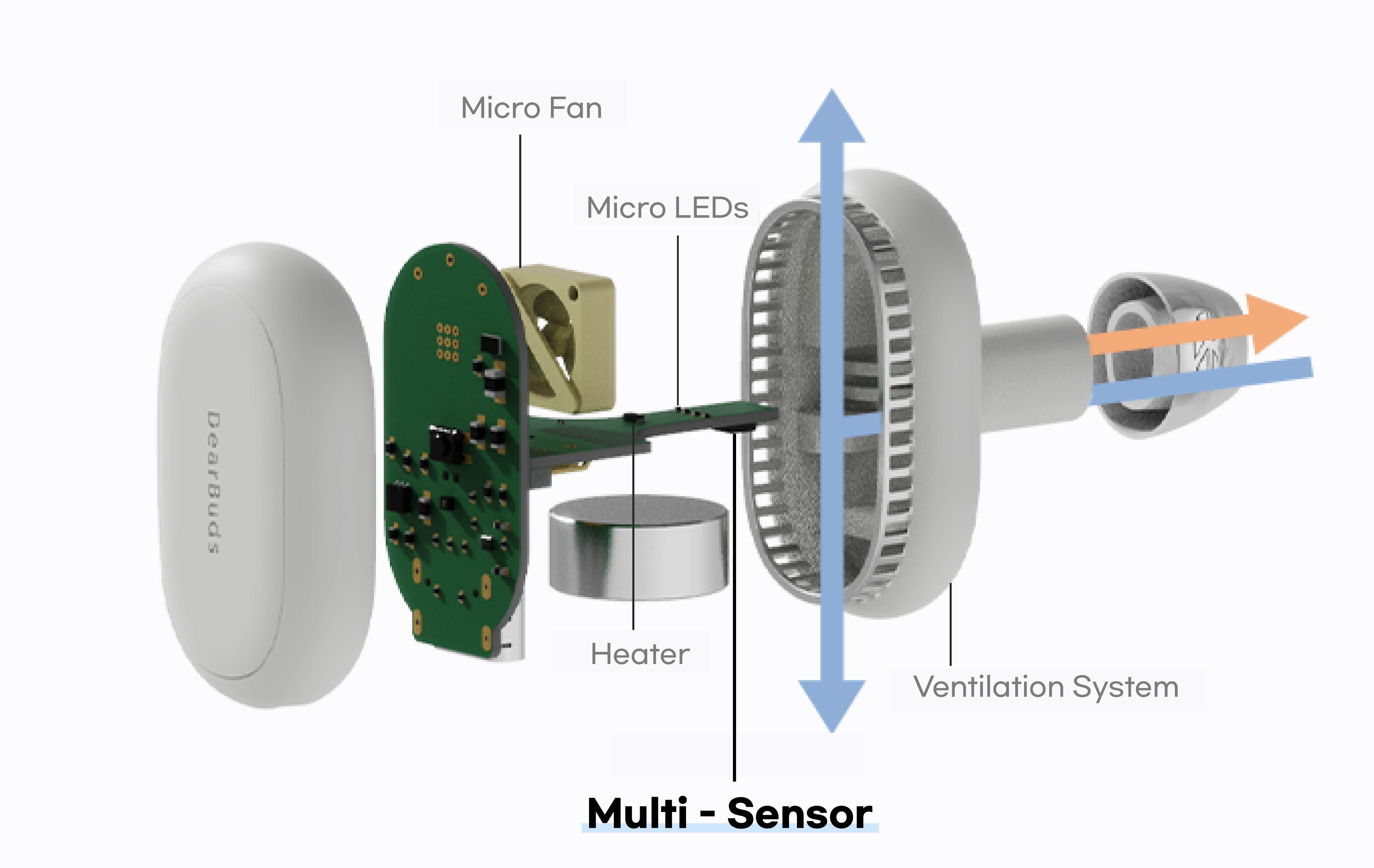 DearBuds SEはマルチセンサーで耳の内部の温・湿度とユーザーのいる環境の温・湿度をリアルタイムで分析します。また、ユーザーのいる地域の天候情報も収集しこれらの情報をベースに耳の中の最適な湿度レベルを設定します。これらの情報をベースに最適な光、熱、そして空気の流れを利用し、耳の中の循環をはやめ過剰な湿気を外に排出します。また、超小型磁気浮上ファンによって速く、静かに、安全に蒸発した湿気を外部に排出します。