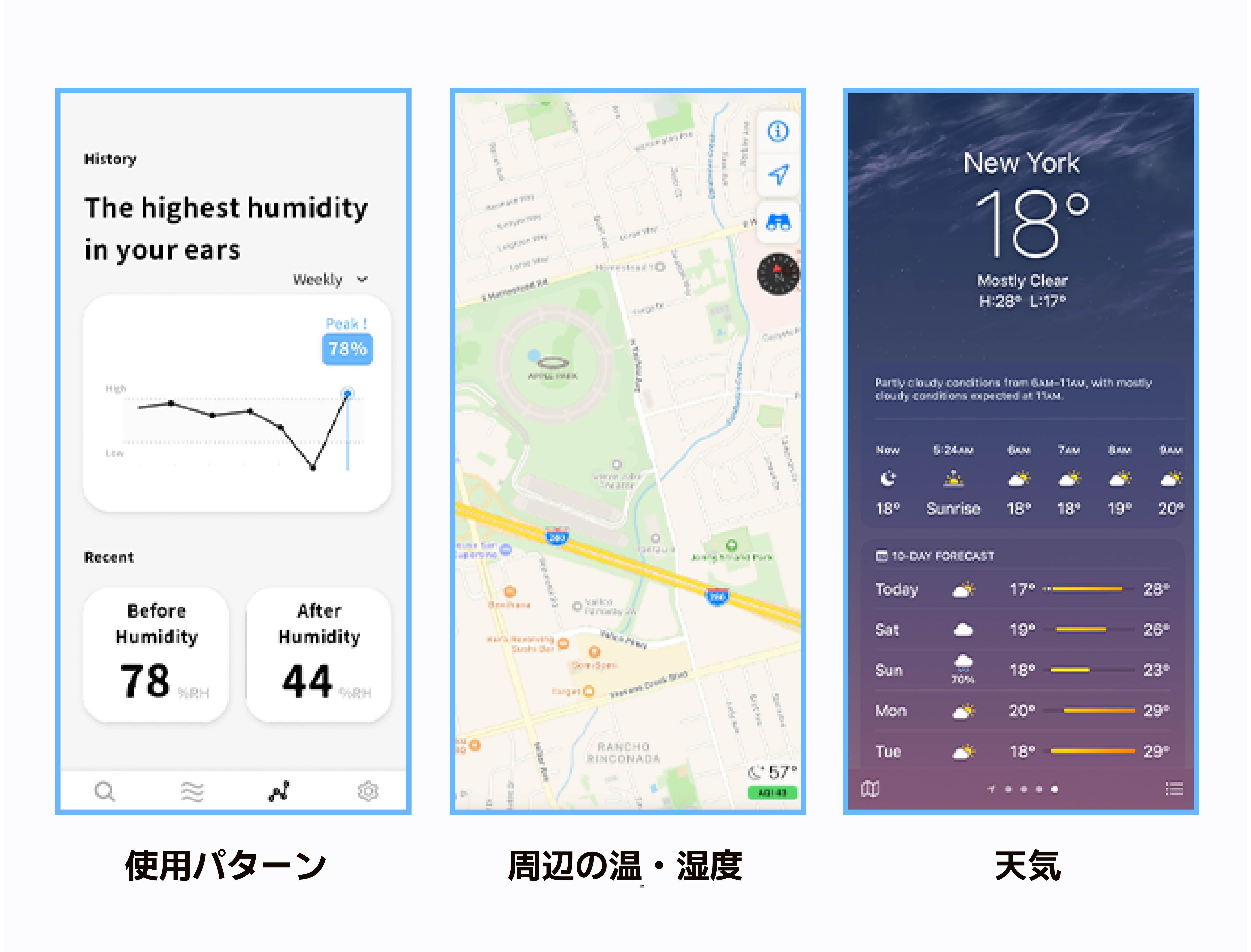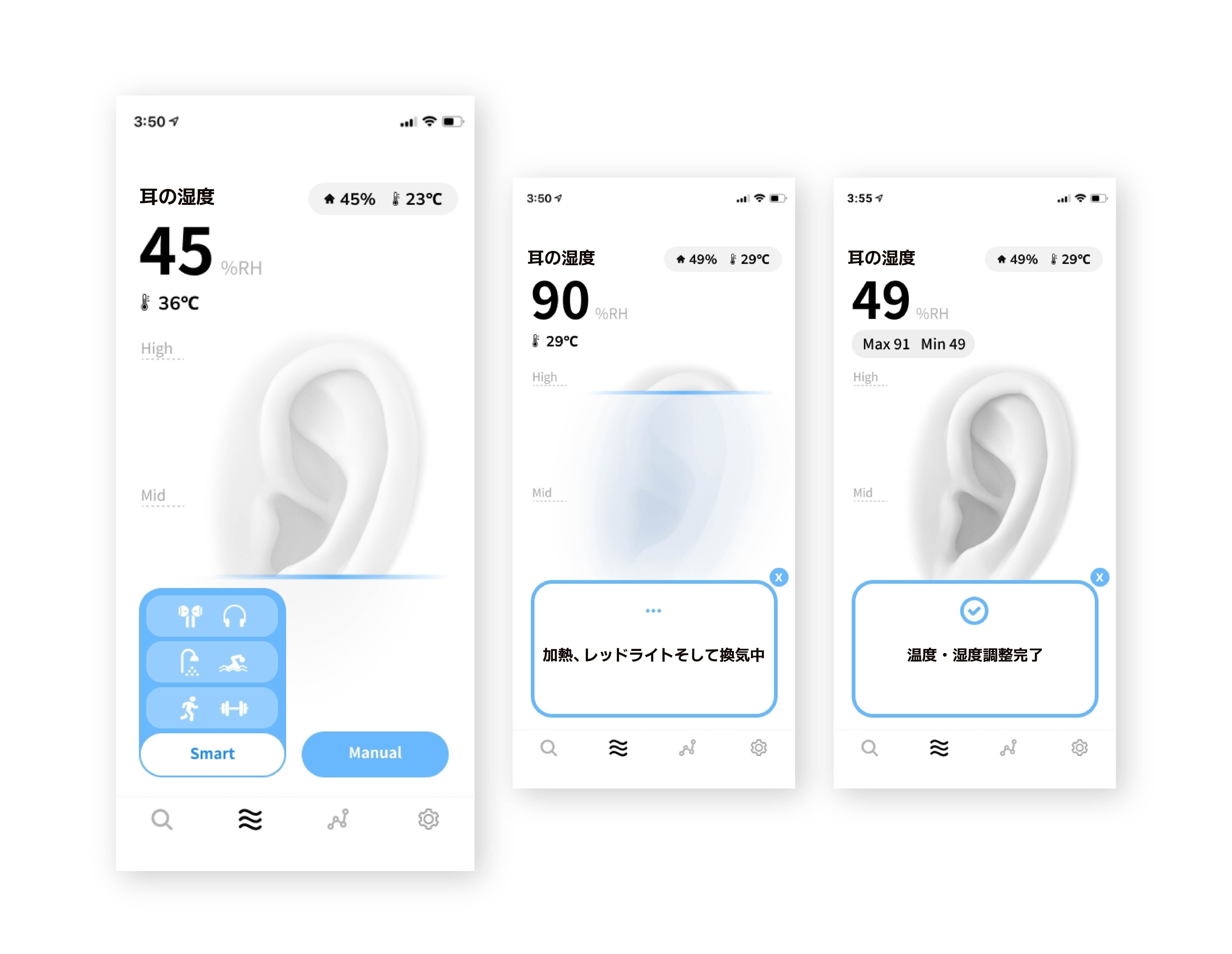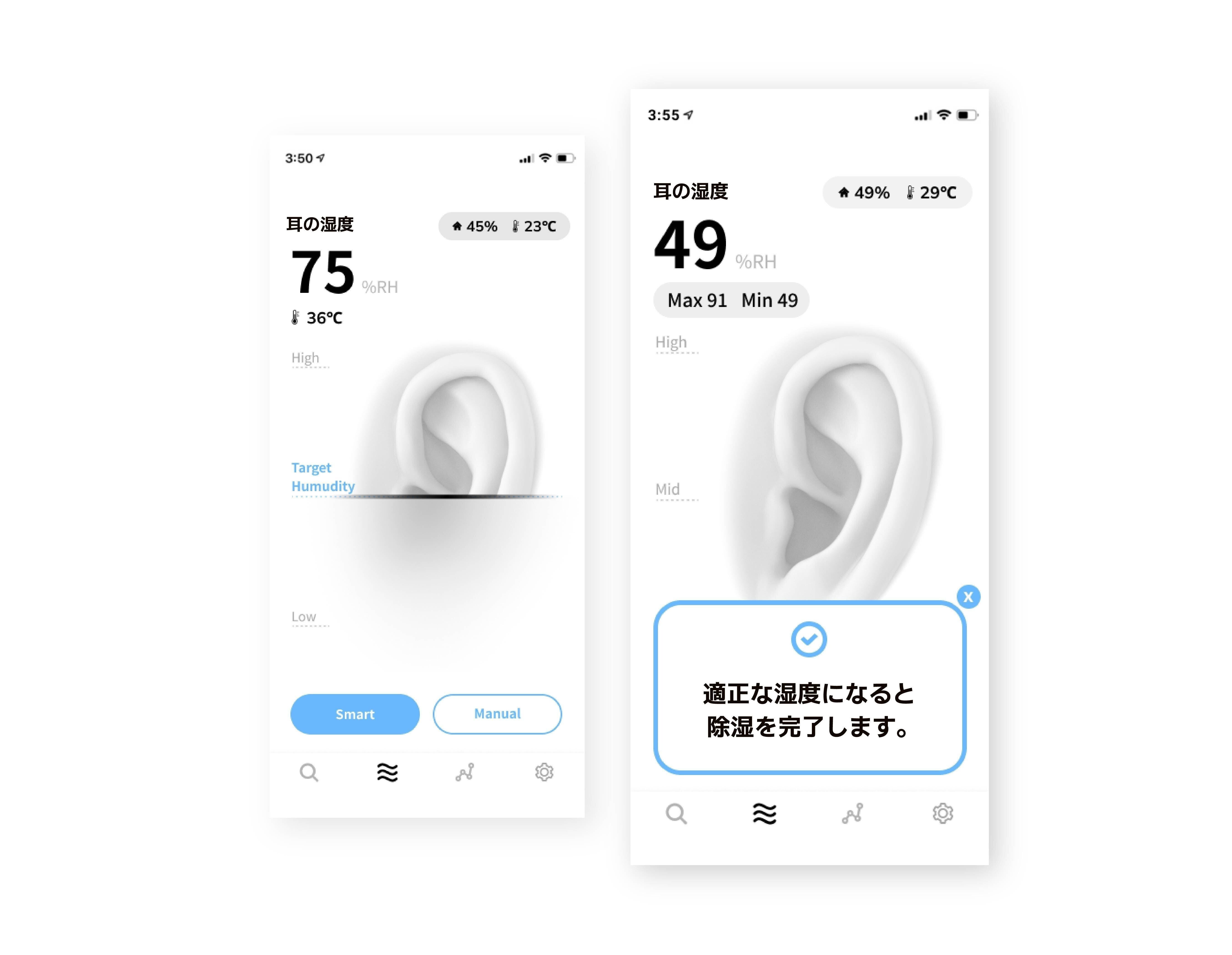 耳の中の温度・湿度情報だけでなくユーザーの様々な利用シーンを考慮したスマートなアルゴリズムによって動きます。耳の中を速く乾かし周囲の環境まで考慮して耳の中を最適なコンディションに導いてくれます。