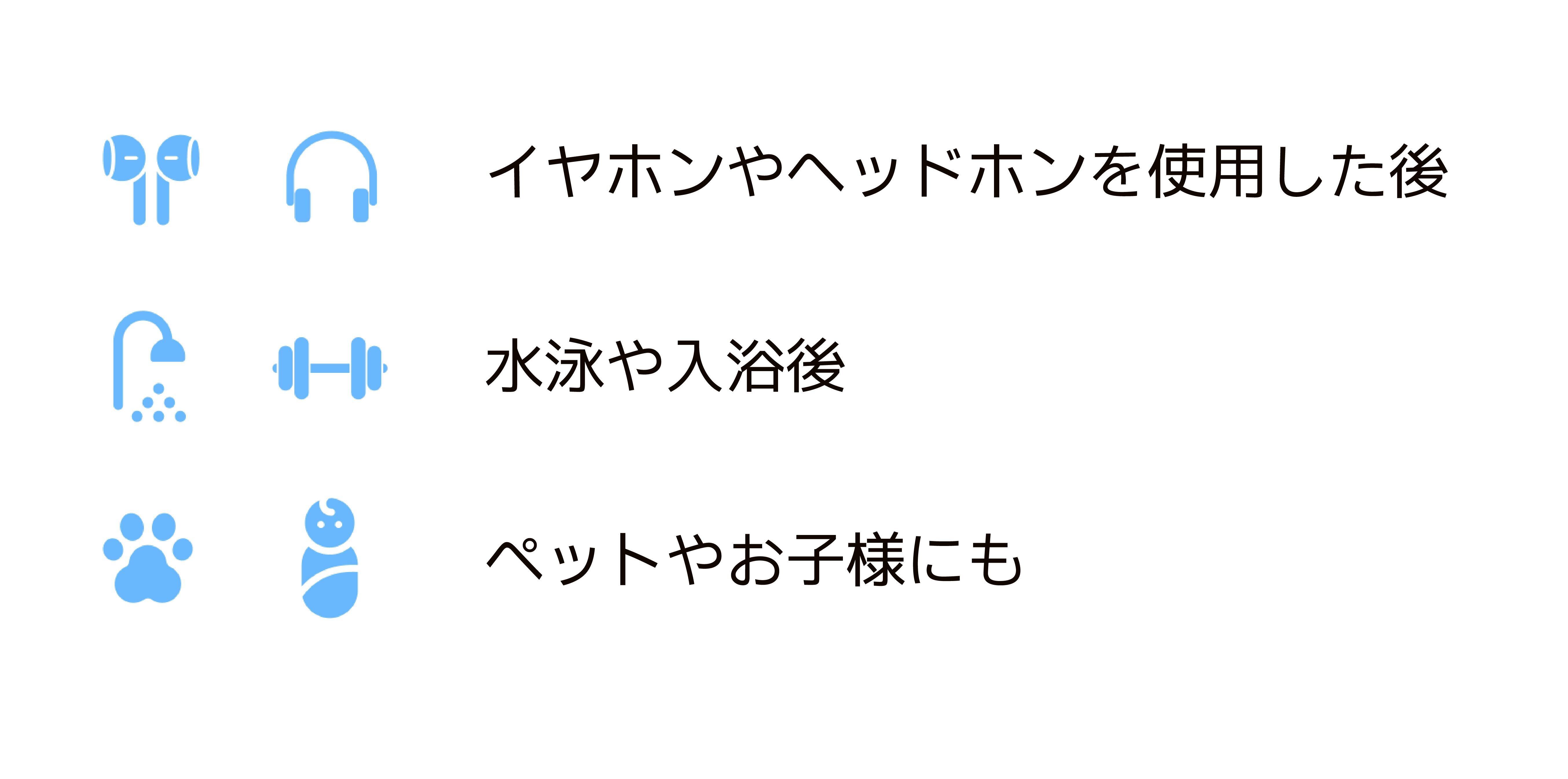 耳垢を押し込んだり鼓膜への影響もありません。安全にもすばやく耳の中の湿気だけを外に引き出します。