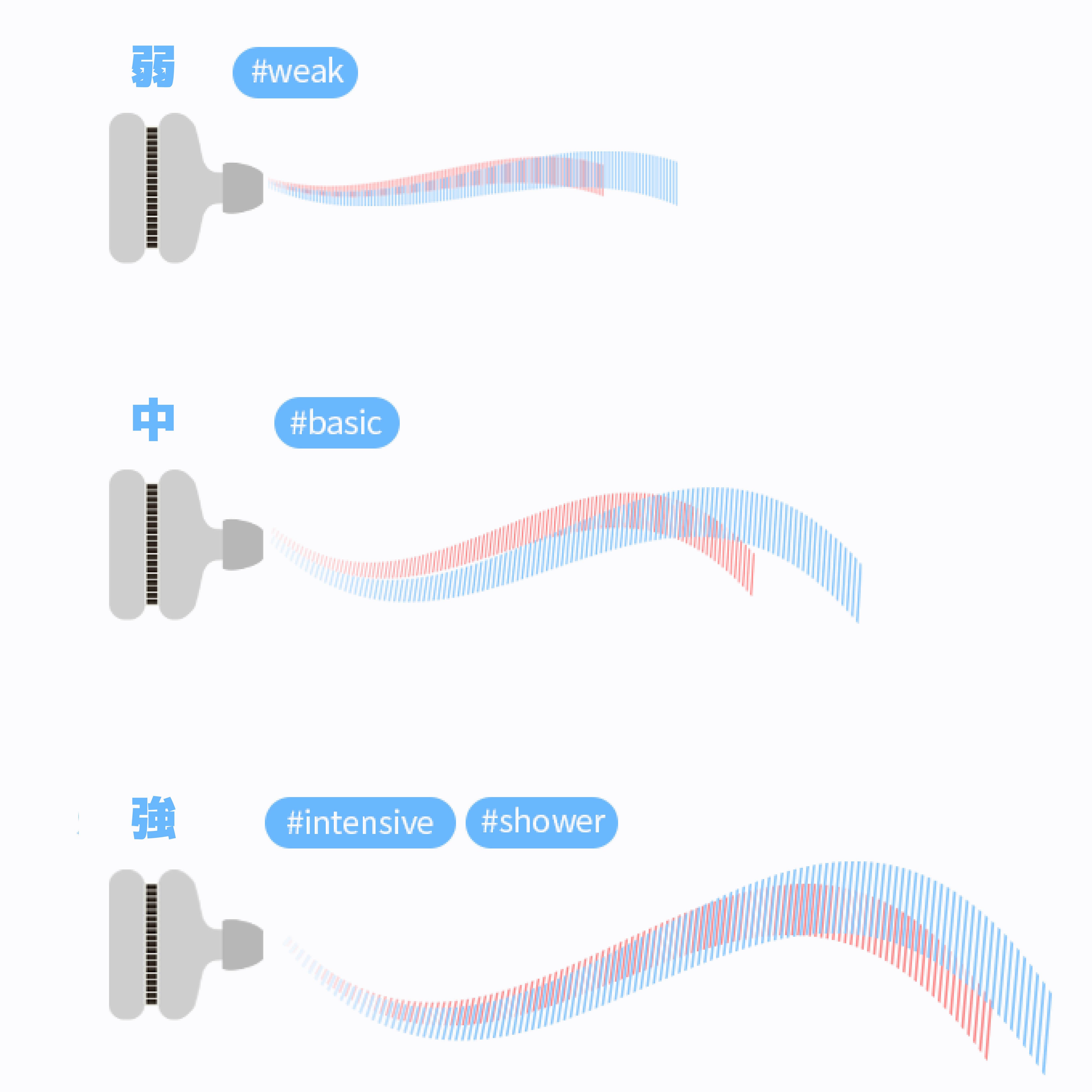 空気の流れを強・中・弱の中から選べます。選んだ強度によって耳の中の換気量と速度が変わります。