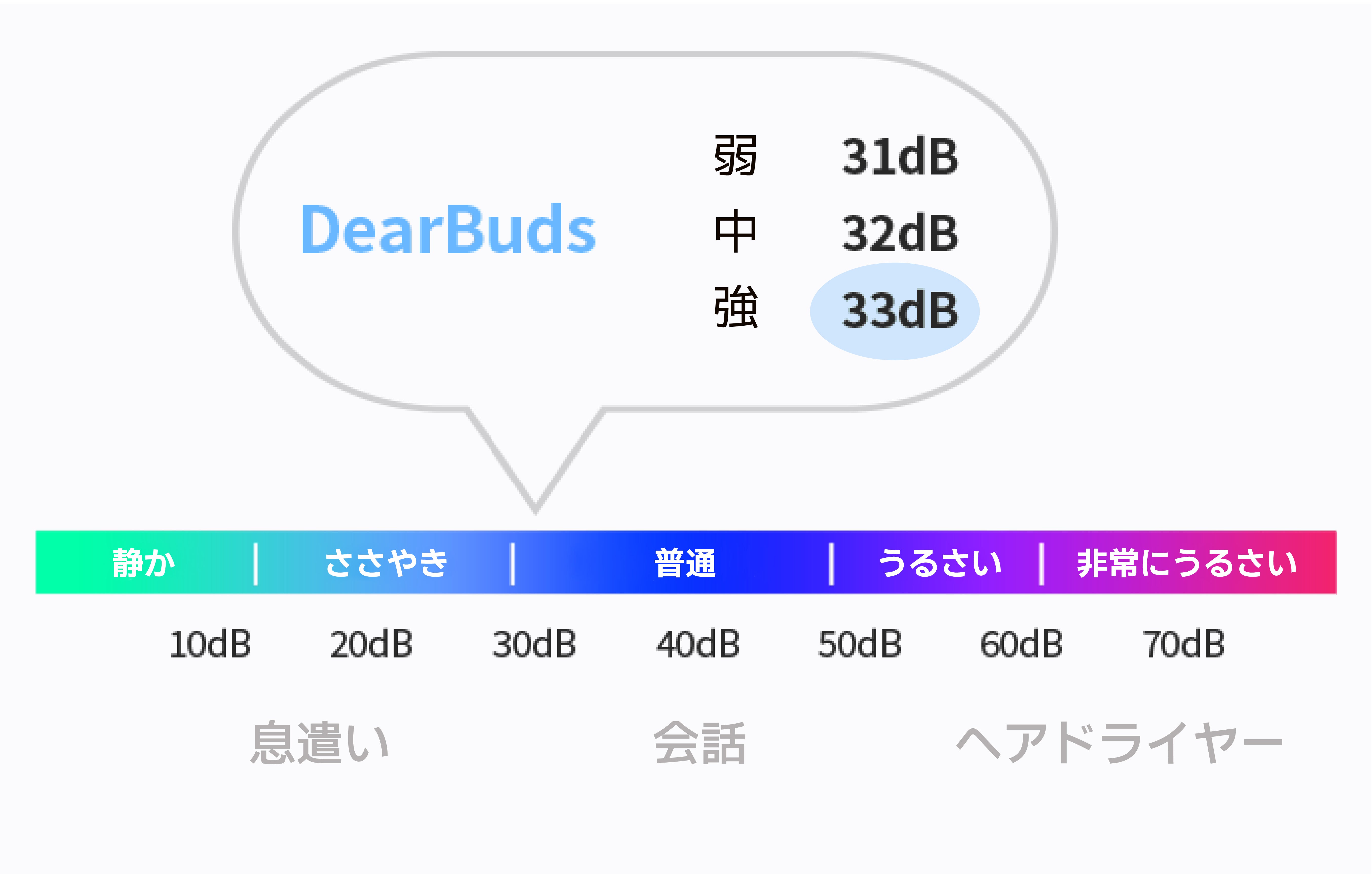 DearBuds SEに搭載されている磁気浮上ファンは最大40dB以下の騒音を発生させ、騒音レベルとしてはきわめて低いです。ただ、DearBudsをお使いの環境によって動作音が大きく聞こえることがあります。
