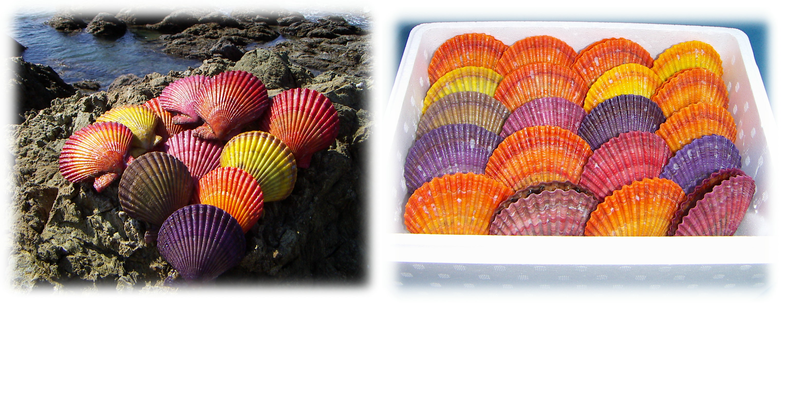 ヒオウギ貝とはホタテ貝に似た食用の貝で、貝殻の色がオレンジ、黄、赤、紫、などカラフルでとても美味しいです。