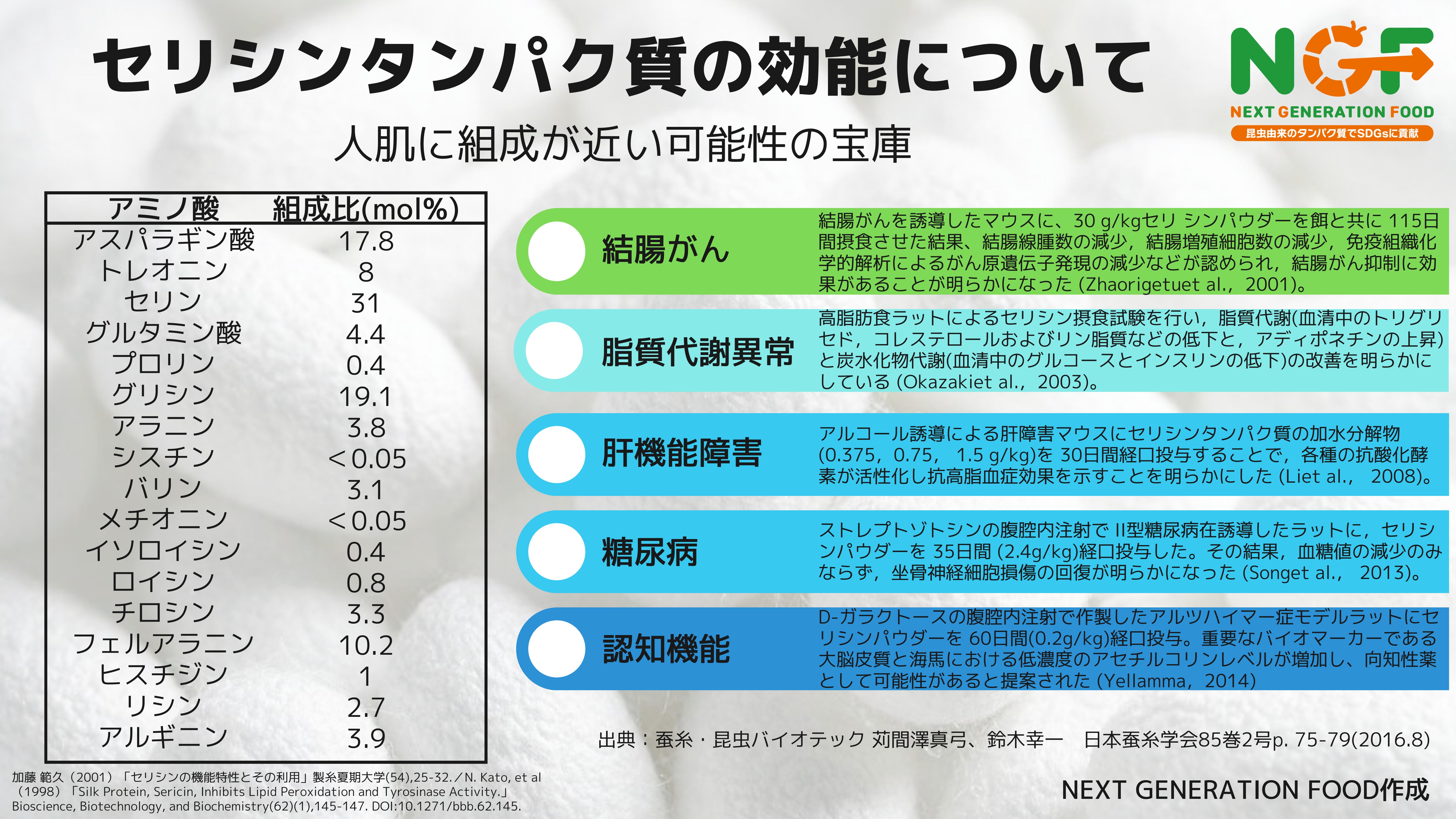 セリシンは、蚕のサナギを紫外線や外敵から守り、美容液や化粧品にも使われている成分で、人の肌と組成が近く親和性があり、高血圧、糖尿病予防、認知機能改善、結腸がんの抑制など様々な効果が期待できます。