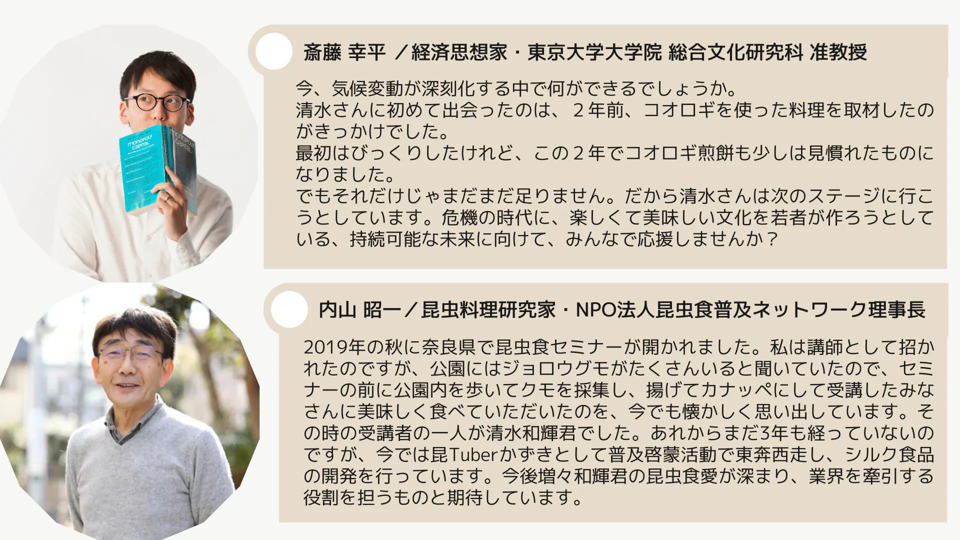 特に、経済思想家・斎藤幸平さんにコオロギ料理を振る舞った際のことは、『ぼくはウーバーで捻挫し、山でシカと闘い、水俣で泣いた』(斎藤幸平著・KADOKAWA)に収録されたところです。