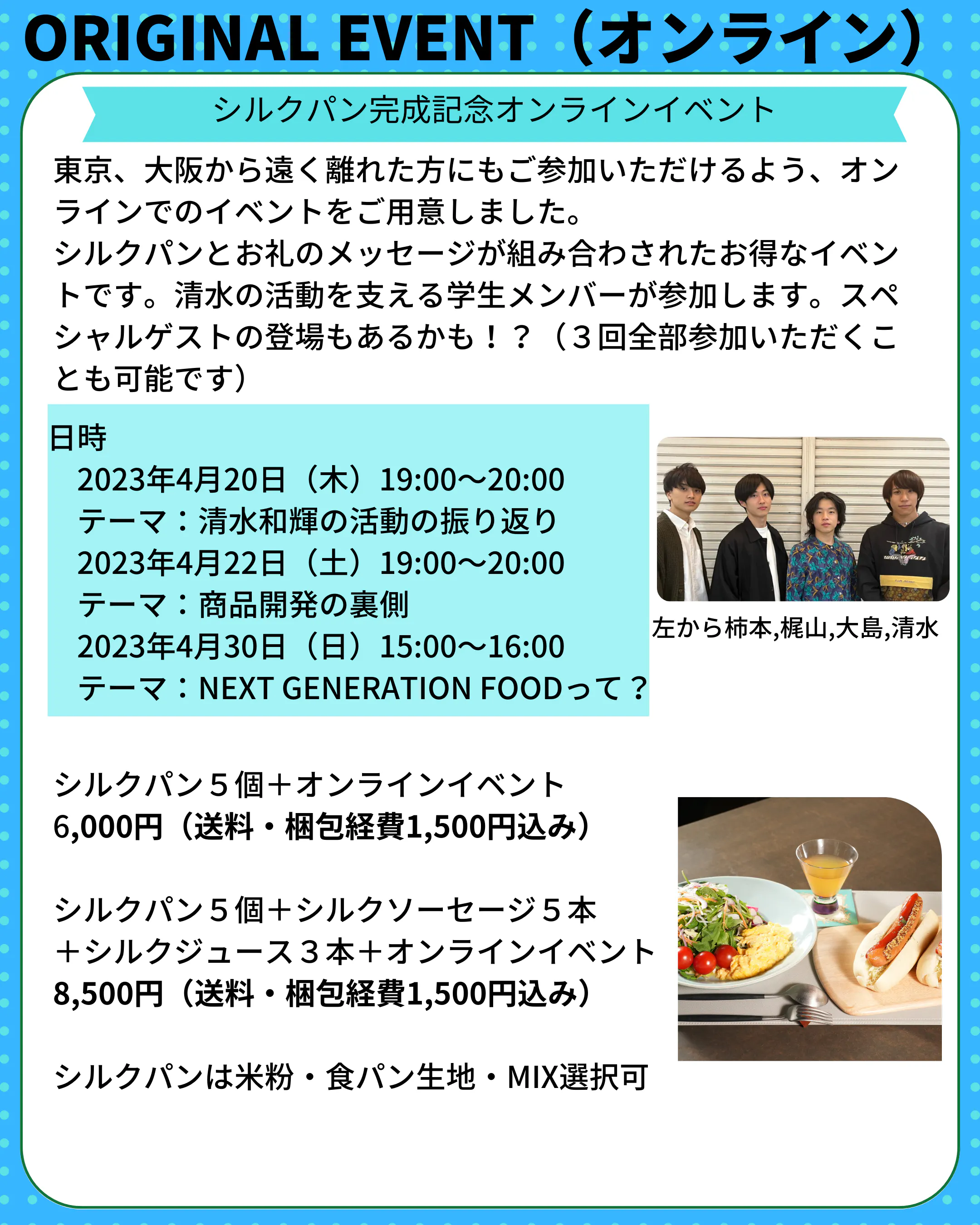 2023/02/26 20:00こんばんは。近畿大学の大島壮一朗です。クラウドファンディング最終日になりました。1ヶ月が短いようでとても長く感じました。支援して頂いた方は本当にありがとうございました。美味しいパンが自宅に届きます‼︎楽しみにしていてください。さて、僕は2021年の7月にかずきさんと出会い、活動に参加するようになりました。大島撮影・天王寺公園にてかずきさんとの出会いそこからかずきさんを支えるみなさんともつながり、シルクの食品を一緒に作ろうという話になりました。パンやホットドッグというアイデアを出したのは僕なのでそれが形になってとても嬉しいです。構想は元々去年の4月には固まっていたのですが、準備や認知をしてもらうための活動に去年は費やしてきました・このプロジェクトを最終目標になんばや神戸のマルイ、地元・東大阪の花園ラグビー場で開催された「花園万博」に出展する日々が生活を占めていました。このシルクパンが目標金額を達成したことはまずとても嬉しかったです。活動が形になるということを学生時代に経験できるのは望んでいるだけではできないので、これまで活動してきた甲斐があったと感じました。この経験は支援いただいた皆さん一人一人のおかげです。これからも社会に還元できる活動を続け、皆様へ恩返ししていきたいと思います。 もっと見る