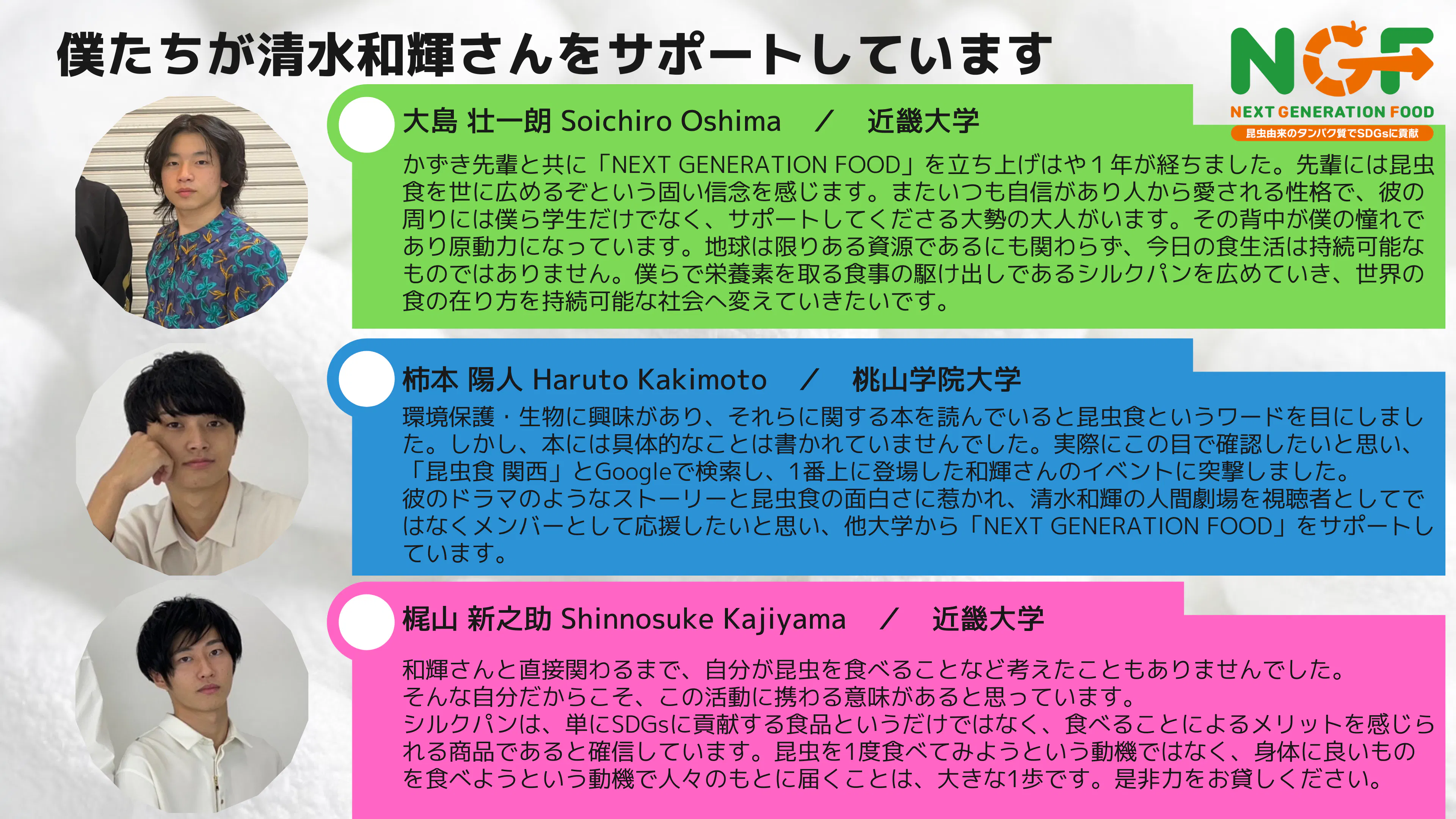 僕が代表を務めるNEXT GENERATION FOODは近畿大学で活動を始めましたが、他大学のメンバーも一緒に参加してくれるようになりました。特に、中心となってサポートしてくれる3人が大島くん、柿本くん、梶山くんの3人です。