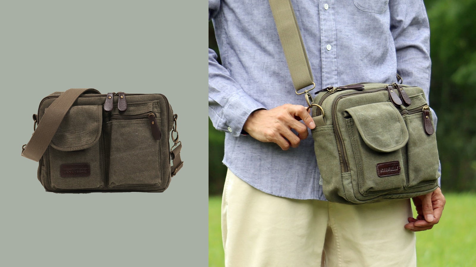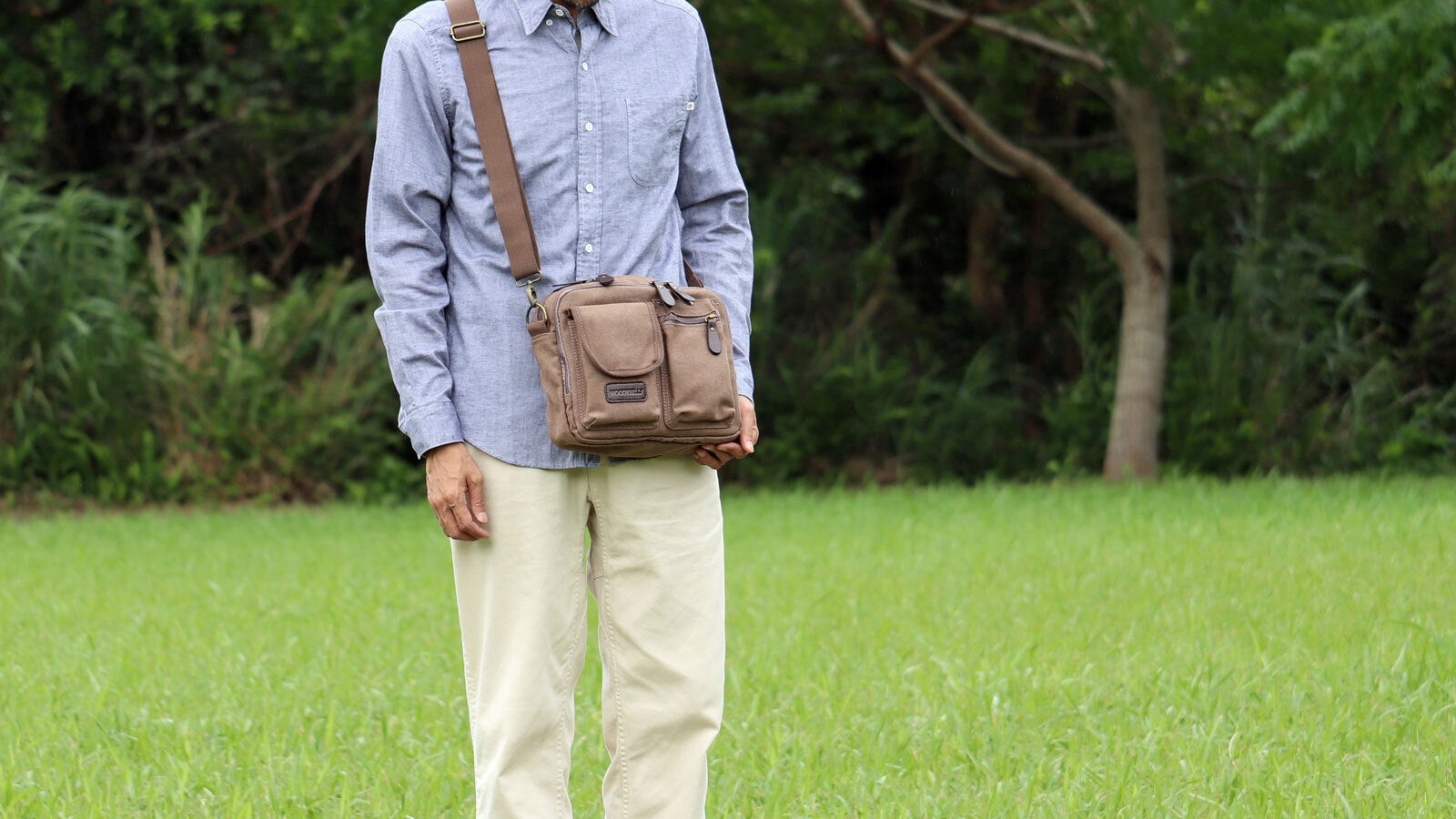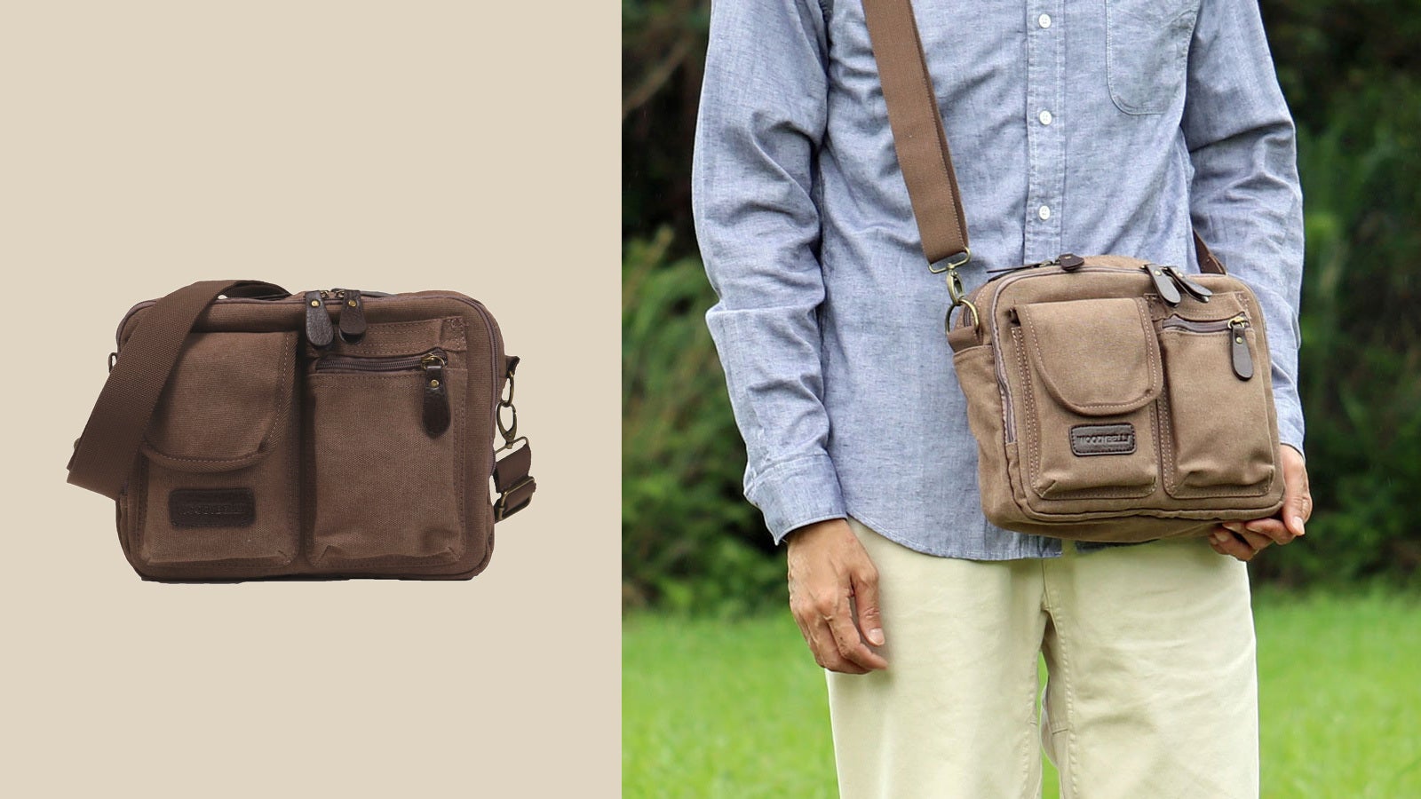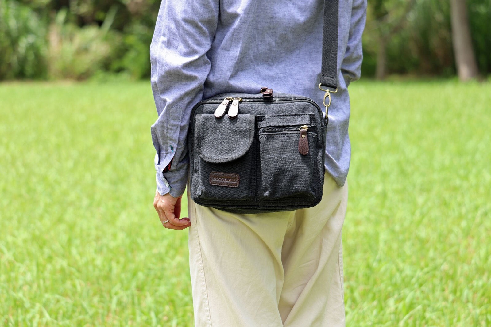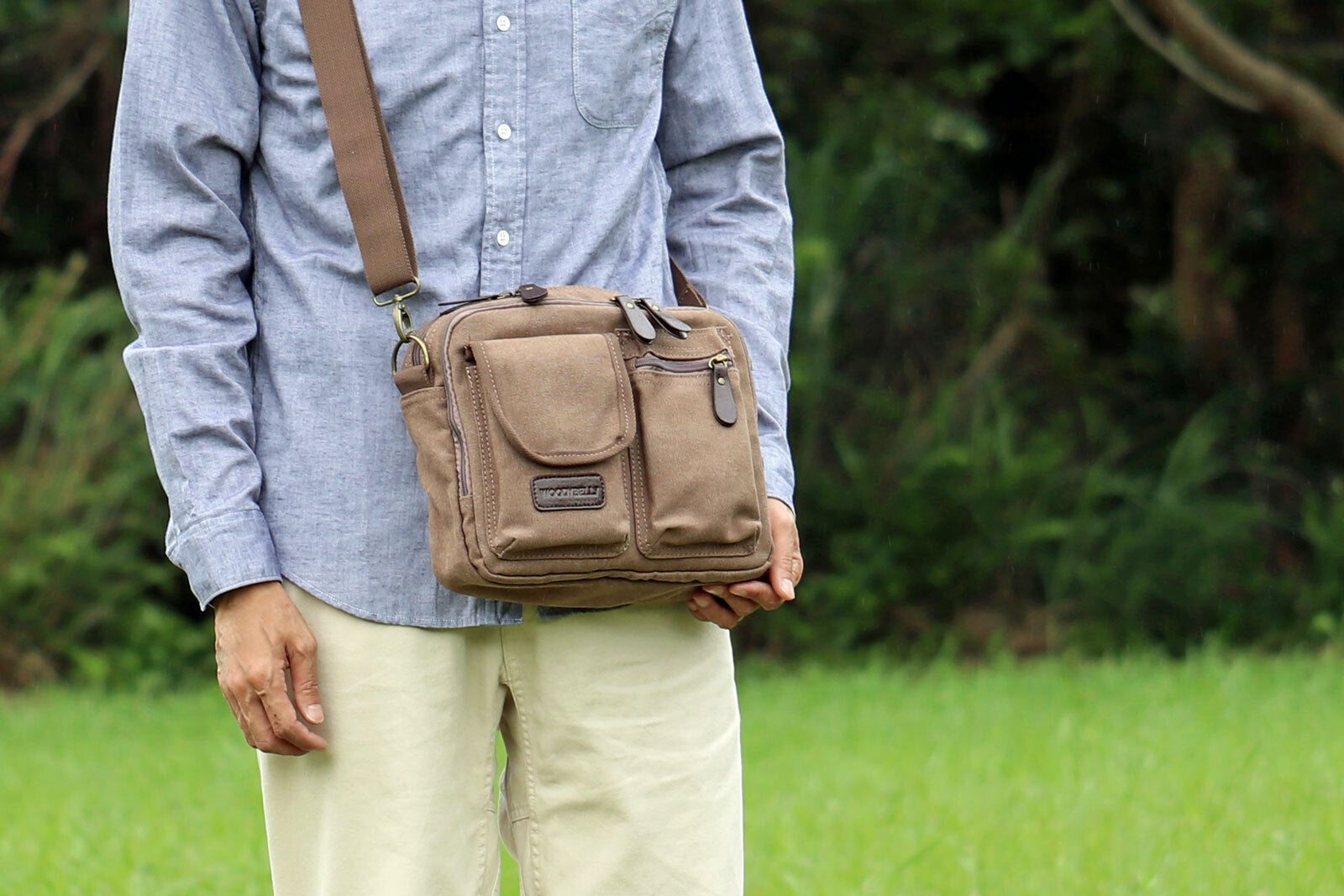 スマホ・ガジェットに即アクセス。分別整頓できる4層構造!軽量帆布ショルダーバッグ