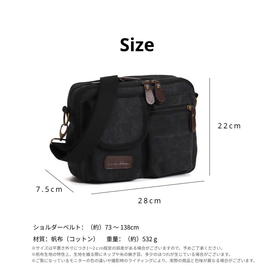 A. バッグ専門工場にて丁寧に生産し出荷前には検品も行っていますが、バッグの縫い目や生地に残っているチョークマーク、洗い加工による生地の濃淡、生地特有の匂いは不良品ではありません。また、製品スペックの縦・横・高さは床に置いて測定した数値です。本製品は針で縫われたバッグ製品で縫い代部分が膨らんだ状態で平たくなっていない場合にサイズに若干の誤差が生じますが、不良ではありませんので予めご了承ください。