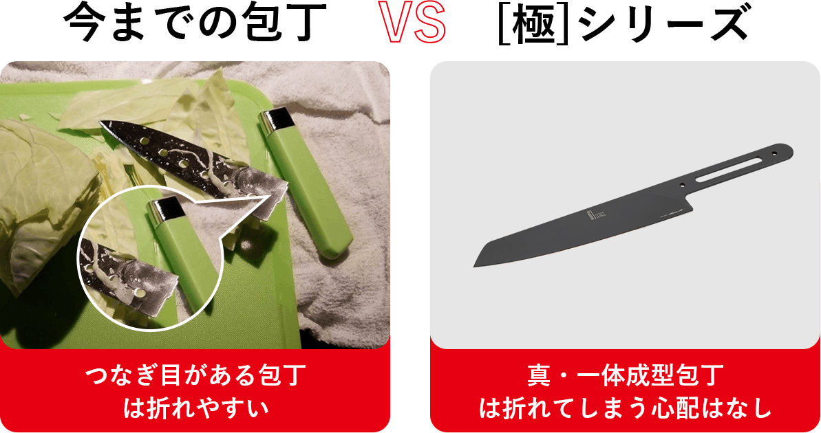 すでに多くの「一体型包丁」が存在するのですが、その多くはブレードとハンドルの部分に溶接によるつなぎ目があるものを「一体成型」と呼ばれています。「極」シリーズは溶接による繋ぎ目もなくした、真の一体成型包丁!
