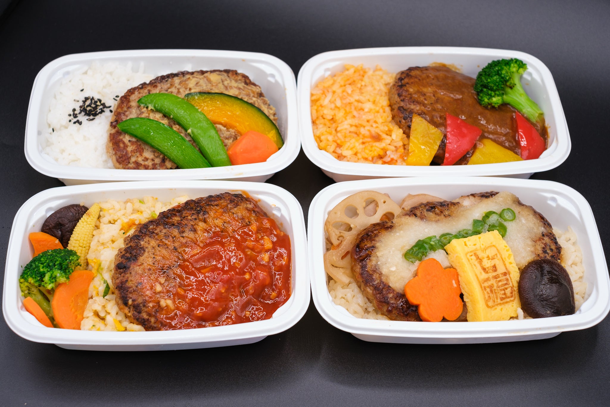 白醤油もろみ味噌ハンバーグ・碧州デミグラスハンバーグ・味醂チリソースハンバーグ・白ぽん酢おろしハンバーグ