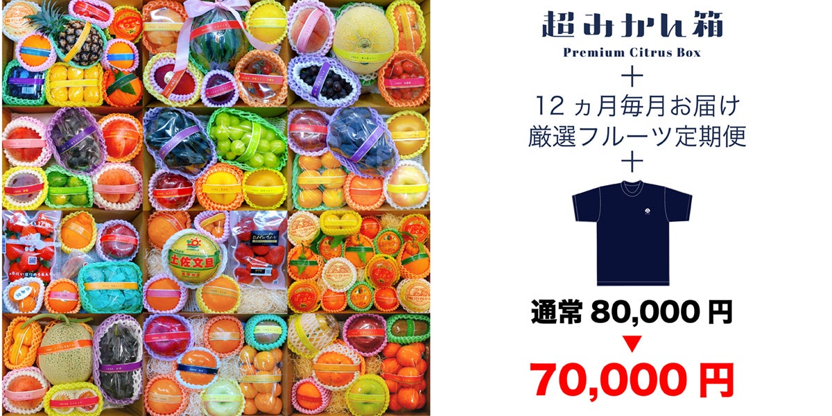 森田セイカ店をたくさん応援してくださる方へ。超みかん箱&毎月届く厳選フルーツ定期便に加えて、オリジナルTシャツというセットです。