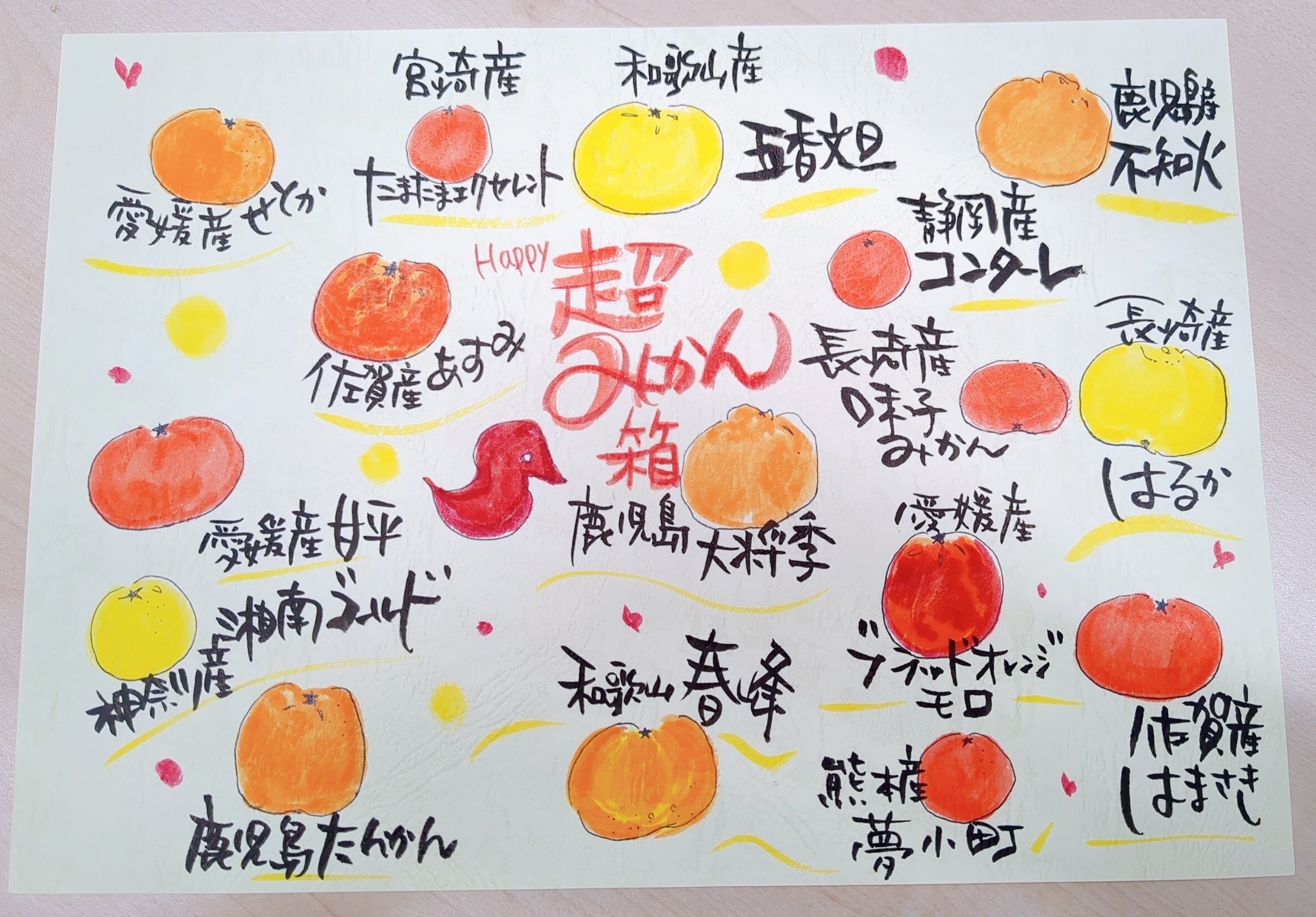 トップの写真は、感激のあまり絵を描いてしまいました、と「超みかん箱」に入っている柑橘たちと、ミニーちゃんを一緒に描いてくれた絵をプレゼントしていただきました!