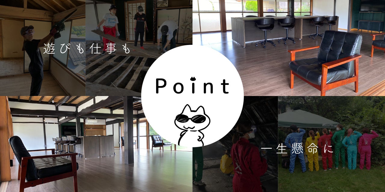 2022年12月 今回の活動拠点として、 山梨県市川三郷町に「Point(ポイント)」という名前のシェアスペースをオープン致しました。 地図で見るととても小さな点でしかない、ひっそりとある田舎。そんな小さな村と大きな街に住む人たちを繋いでいきたい。そんな想いから付けた名前です。ここは都心の人が田舎の美味しい空気を吸いながら仕事ができるスペースでもあり、地域の人たちが集まるコミュニティスペースでもあり、ワクワクするようなイベントスペースでもあり、夏はキャンプ・冬はスキーなど遊びの拠点にもなります。 そう、みんなが元気になるためなら、何でもできる場所なんです。 様々なイベントを開催する予定ですので、お時間があるときに是非お越しください!