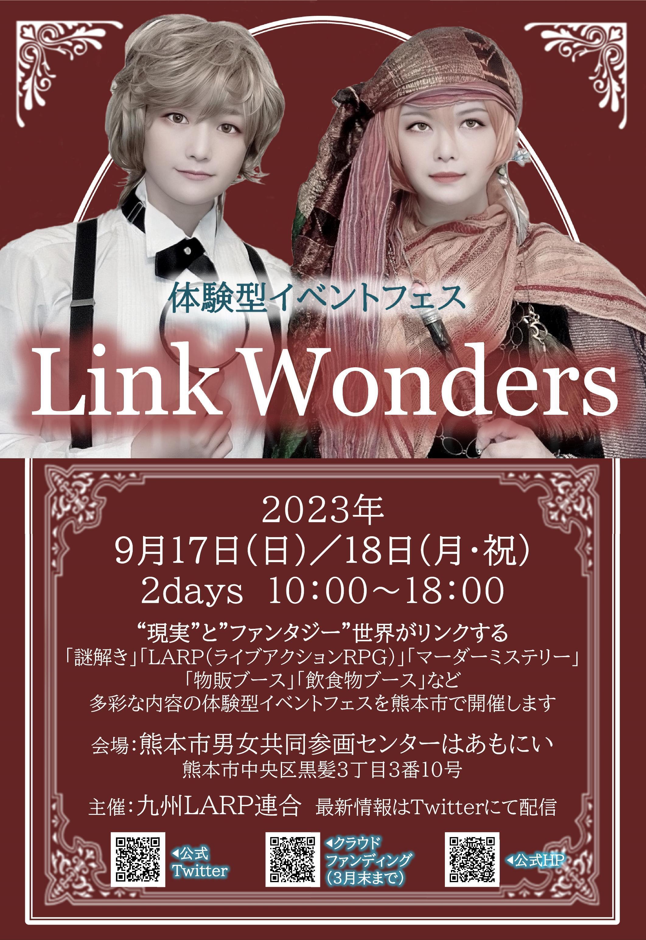皆さまこんにちは!5回目の活動報告をいたします、九州LARP連合です。【出展団体募集中!】体験型イベントフェス「Link Wonders」は開催日時も決まり、 マーダーミステリー、謎解き、LARPといった体験型イベントと、ファンタジーマーケットの出展者を【3/21まで】募集しています。まだ部屋もスペースも余裕があるため、今からでも駆け込み応募間に合いますよ!公演(部屋貸)の方は現在のお申込み状況は【マーダーミステリー2団体】【謎解き4団体】【LARP 3団体】からお申込みをいただいております。ファンタジーマーケットの方も、【アクセサリー】【雑貨】【LARP武器】【飲食】 【リーディング(占い)】【整体(マッサージ)】【アート】など幅広い内容で9団体のお申込みをいただいています。↑写真は先日熊本で開催された九州蒸気会イベント「九州蒸気カイギ」主催の言さん(掲載許可済感謝御礼)これって体験型イベントで申し込んでいいのかな?ファンタジーマーケットに含んで良いのかな?と、不安なときはいつでもご相談ください(*´◒`*)・イマーシブシアターや、まだ世に知られていない体験型イベントでのお申込みも大歓迎!・食器類使い放題の「食のアトリエ」は調理室付きなので、飲食販売にご興味ある方いらっしゃいませんか?・省スペースで謎解きやイベントを行う「カフェ謎」も、フェス系イベントでは空き時間が出るため人気がありますよ!etcetc...皆さまのご応募、心よりお待ちしております!===入場券付き応援セットのお知らせ=== Link Wondersは日本全国津々浦々、様々なところからお申込みをいただいております。熊本に全国から有名な体験型イベント団体様が集まるという、今までにない機会。是非、行きたい公演を確実に抑えるクラウドファンディングプラン「入場券付き応援チケット」をご購入の上、今後の情報発表をお待ちください。※クラウドファンディングのプランの1つのため、発売期間は2023/3/31まで。 入場券付き応援セットをご購入いただくと、普通にチケットを購入するより1日早く各団体の公演をご購入いただけます。3月25日(土)には全ての団体が揃う予定です。気になる団体や参加したい公演がある方は、参加団体をチェックの上、こちらの入場券付き応援セットを追加購入されてはいかがでしょうか?引き続き、応援宜しくお願いいたします!