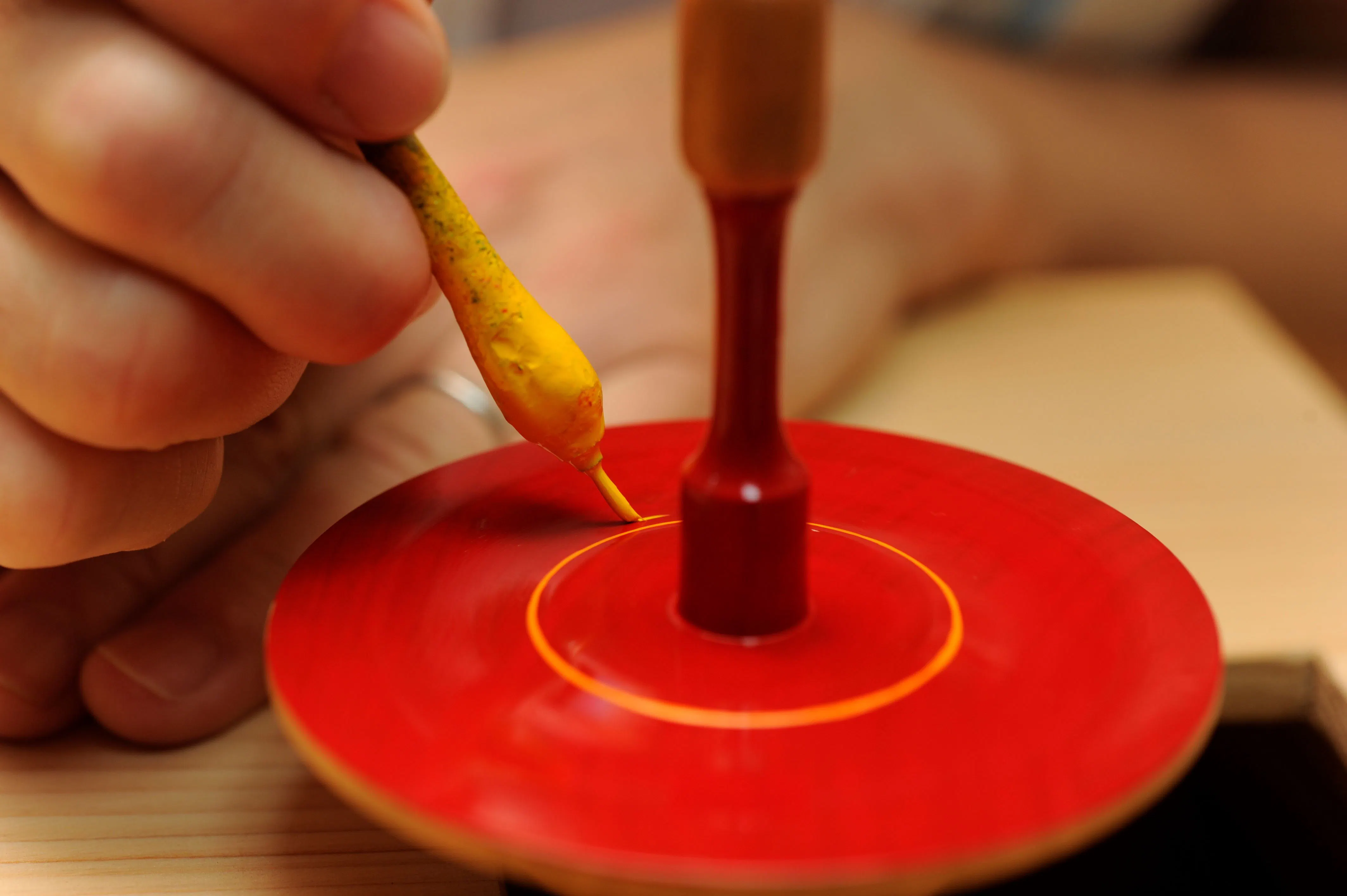 私が削った独楽に、ひとつひとつ色付けしてくれるのが妻である、しげ子の仕事です。妻は毎回、「今日はどんな色を塗ろうかな」と楽しみながら作業しているそうです。そのハッピーカラーな色味は、「運気が良くなりそうだ」「眺めているだけで幸せな気分になる」と多くのお客様に喜んでいただいてまして、実際、独楽は〝芯がぶれない〟という意味を持った縁起物でもあるのです。