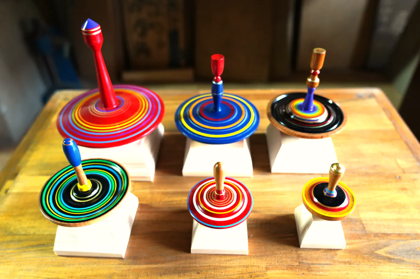 「轆轤木地師」とは、轆轤を使って木を削って、お椀やお盆など丸みのある木工製品を生み出す職人で、滋賀県がその発祥地と言われています。この技術を活かした遊び心のある名産品を作りたいと思ったのが、新快速電車の延伸と「黒壁」効果で長浜に観光客が増えてきた1990年頃。「アート・イン・ナガハマ」という芸術イベントも丁度はじまって、たまたまそこで知己を得た芸術家さんからのアドバイスもあって『いろ色浜独楽』の発想が生まれました。